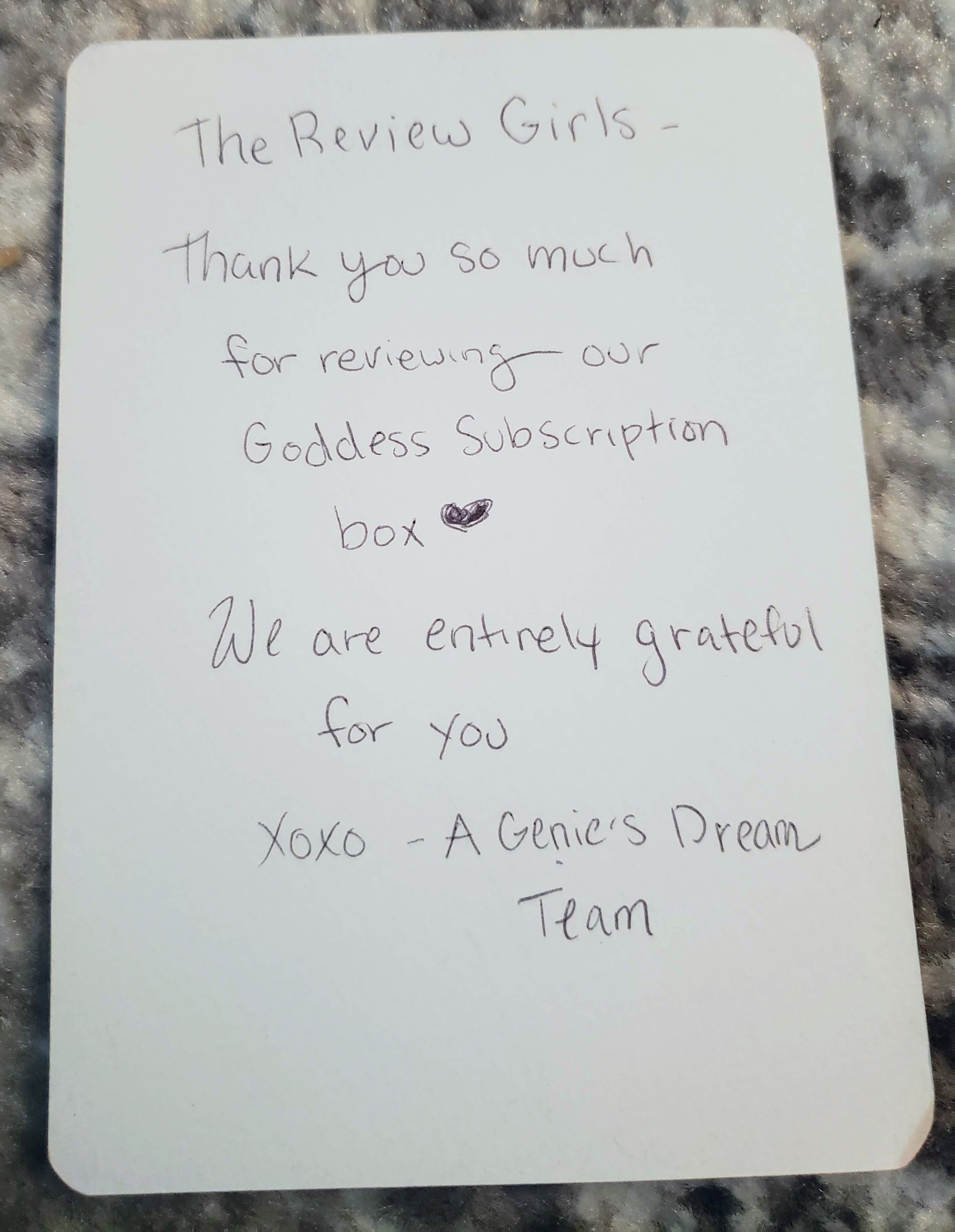 Website Description of Box: “A Genie’s Dream is here to help women come to acceptance with their natural “gifts” in order to feel inspired by it, taking them to another state of mind and world. Instead of letting our natural, bodily cycle bum us out every month, we should use it as an opportunity to take our mind and spirit on an adventure into our own personal enchantment filled with dreaminess, intoxication and inspiration. Our monthly subscription tubes are filled with gifts that will unveil, inspire, and comfort your mystical soul, revealing the inner genie goddess in us all!”