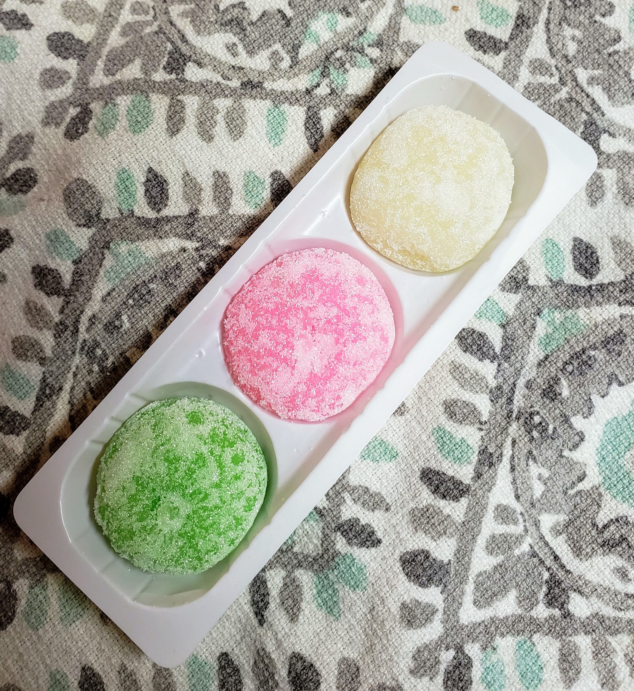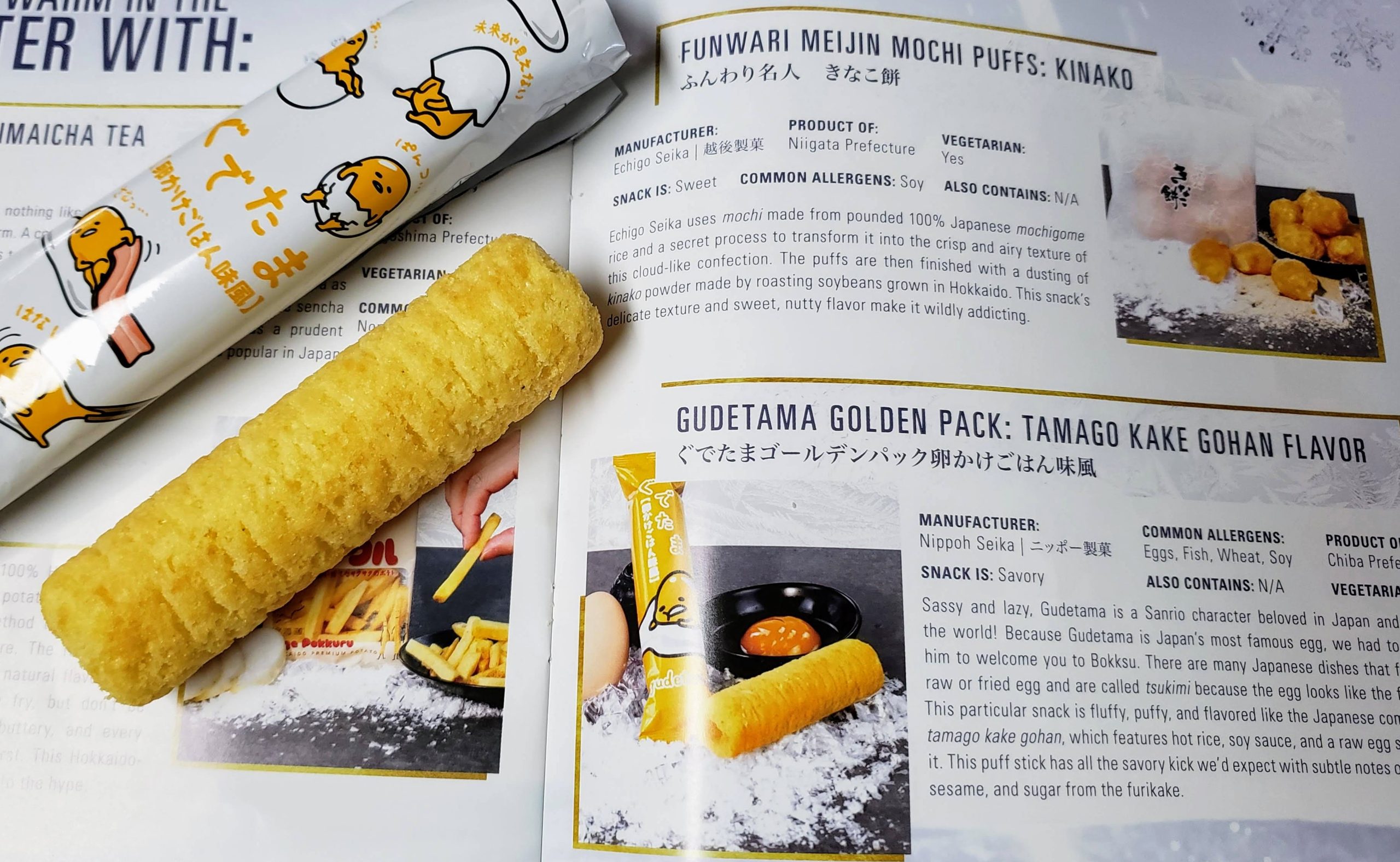 It is nice that Bokksu also includes tea in their box since they have such amazing selections for us to learn about while tasting them. The genmaicha tea included this month is a mix of green tea and roasted brown rice. Upon first brewing it, I noticed what I thought to be a nutty aroma, however upon tasting it realized that was the roasted rice I was smelling. I gifted the Hakkaido potatoes to Noelle, again to let her see what the Bokksu box is all about. She said they were delicious! The mochi puffs are very unique, they are basically air crisps with a sweet glaze. I really like the taste, but I don’t have much to compare them too. You need to try it to get what is so cool about then. Lastly, the Sanrio character Gudetama made an appearance in our box which I thought was adorable! Although, I’m not sure how to describe the stick since I devoured it so quickly. I would say it was like a crisp, puffy chip with a sweet side to it.