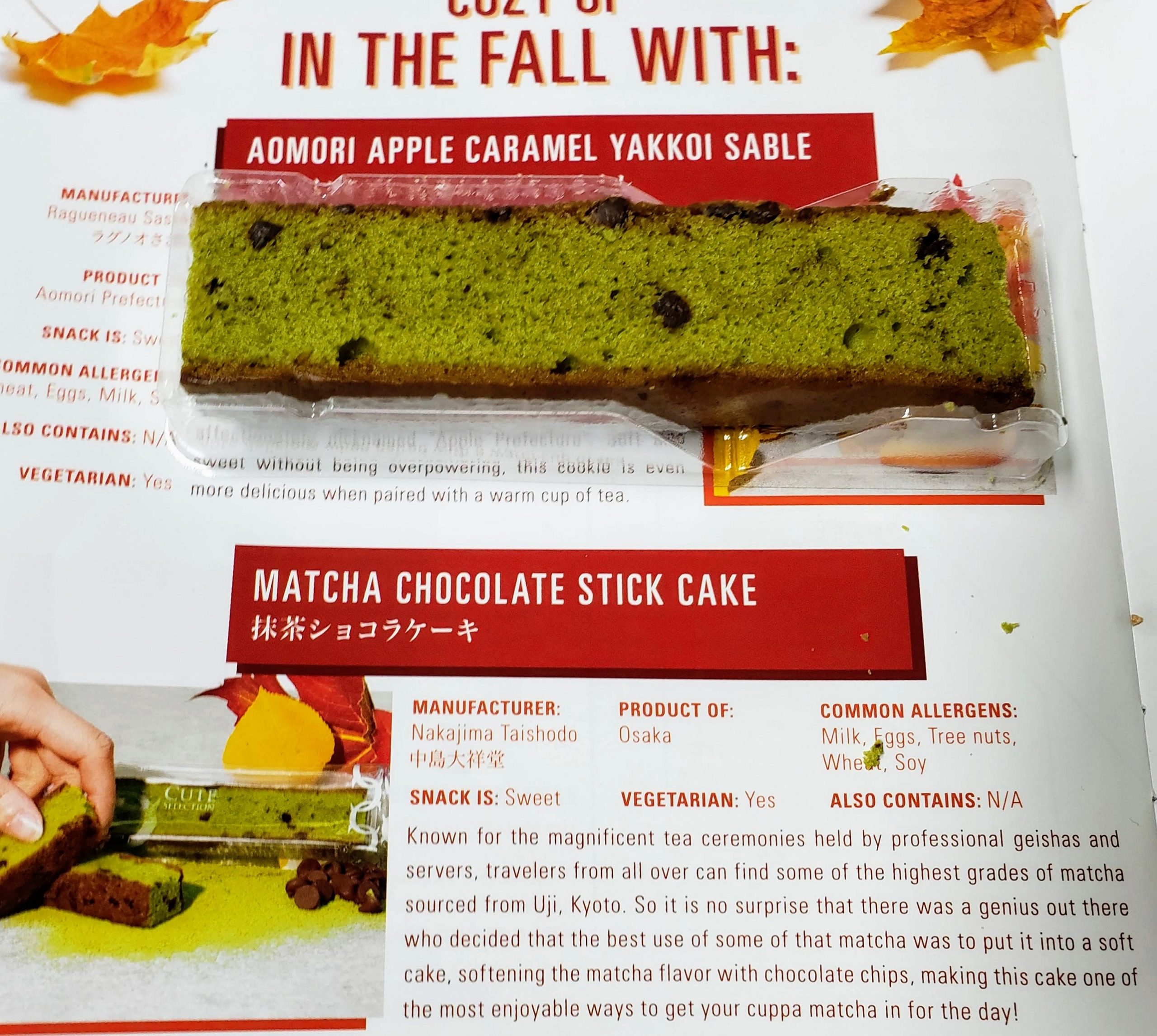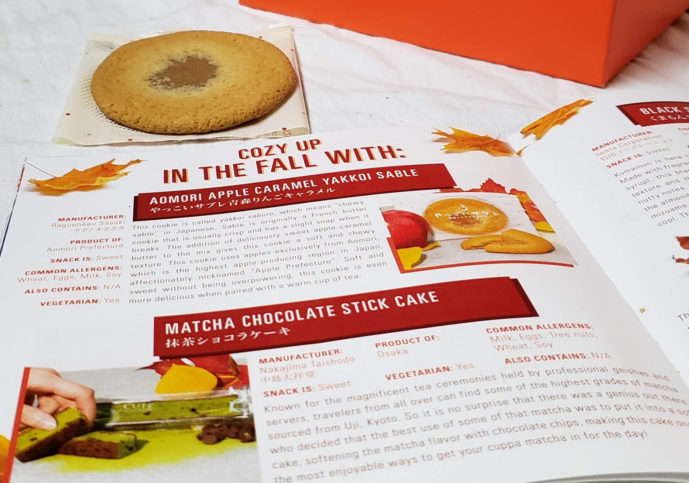 The fall season was one that I was really looking forward to eating my way through. Fall is my absolute favorite time of year. And when I saw the line up of snacks for the season, I knew they would be a win for me. All four snacks were amazing in their own right. My (and my husband’s) favorite out of the four was the black sesame taiko. While it may look like a bird treat (comment from my son) it tastes like heaven. The sugar syrup holds together toasted almonds and sesame making this treat as filling as it is appetizing. The Apple Caramel cookie was my son’s favorite, we both loved the soft chewy texture. The match chocoalte stick cake was unusual and had a soft springy texture. I wasn’t expecting to like the cake, but it was quite pleasing. Lastly, the red bean crackers reminded me of animal crackers with a bit of red bean filling added. They were delicious, especially is you love red bean paste as much as I do!
