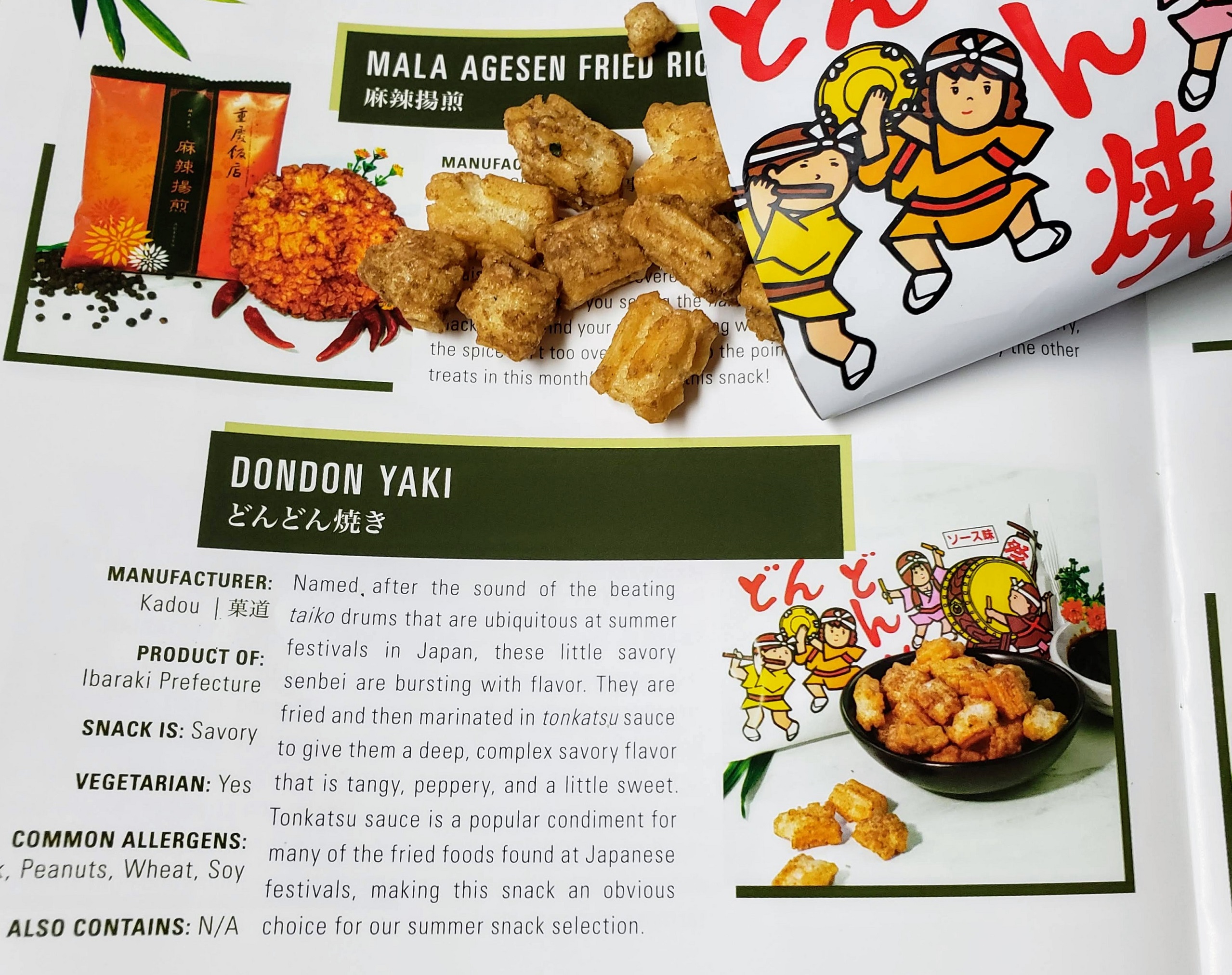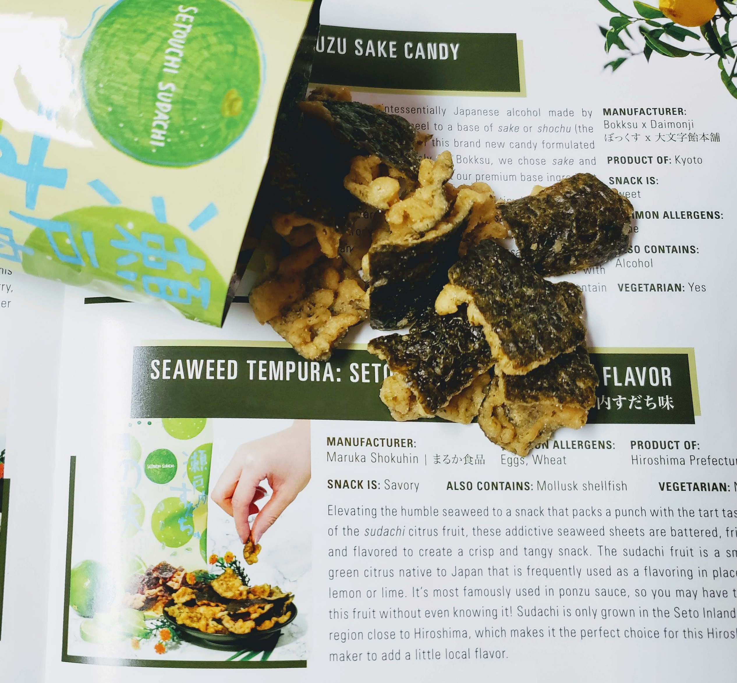 Let’s start with the Sake Candy, I tried one and thought it had a refreshing citrus taste. The ziplock bag was nice since there was no way I could finish the whole bag at once. I ended up gifting the rest of the bag to Noelle so she could get a taste of what Bokksu has to offer. The other three snacks were classified as “savory” and savory they were! The rice cracker reminded me of a spicy rice cake. It was very good! The Dondon Yaki is hard to compare to anything, but I liked the fried treat. My favorite snack from the summer season was the citrus-flavored seaweed tempura. Seaweed is such a delicious snack, I really liked the tart flavor of this battered and fried treat!