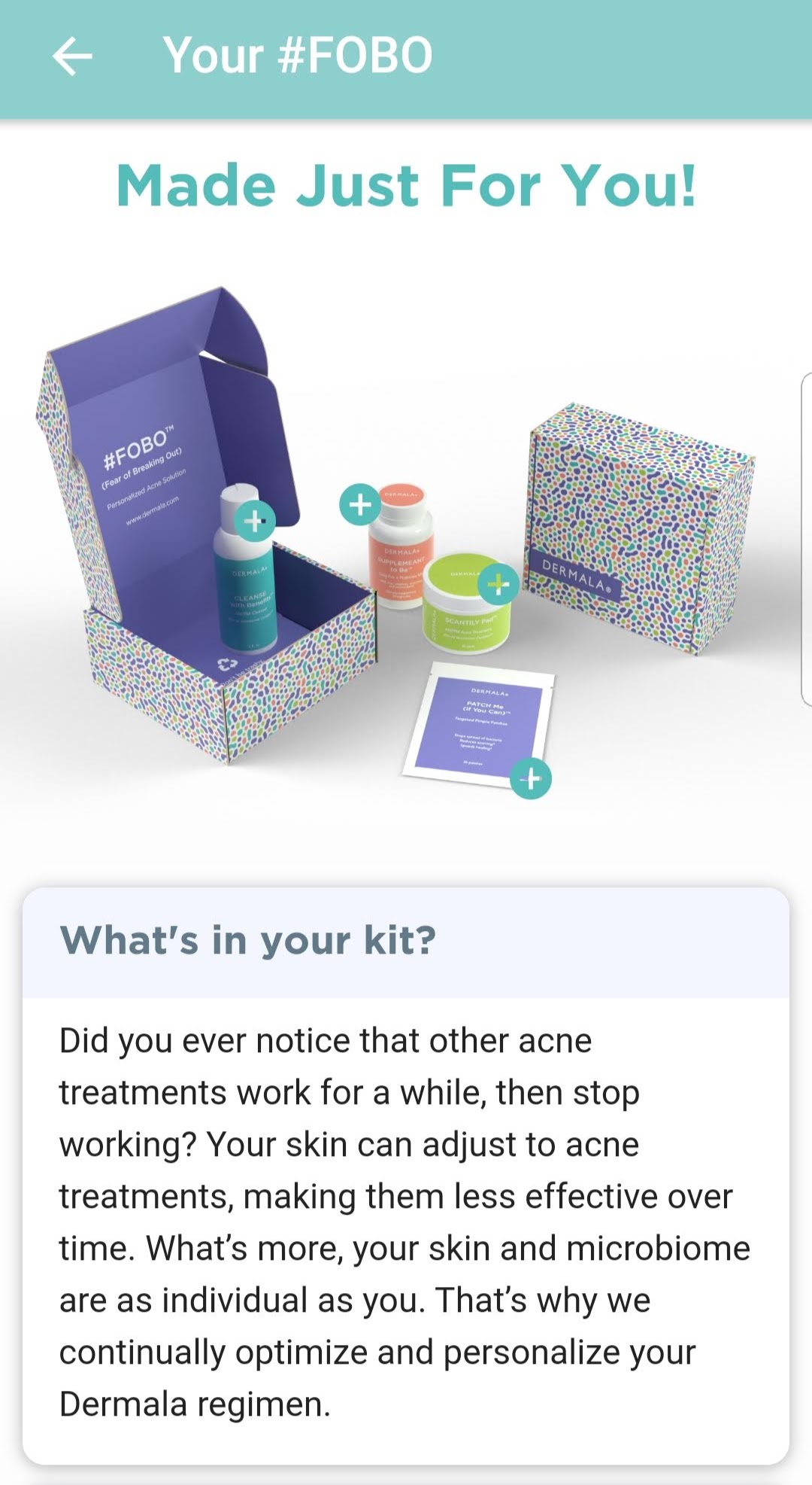 Another cool feature that Dermala offers is their free app. It offers tips for clearer skin based on a short quiz and or pictures of your skin. The more you update it the more personalized they can make your next kit.