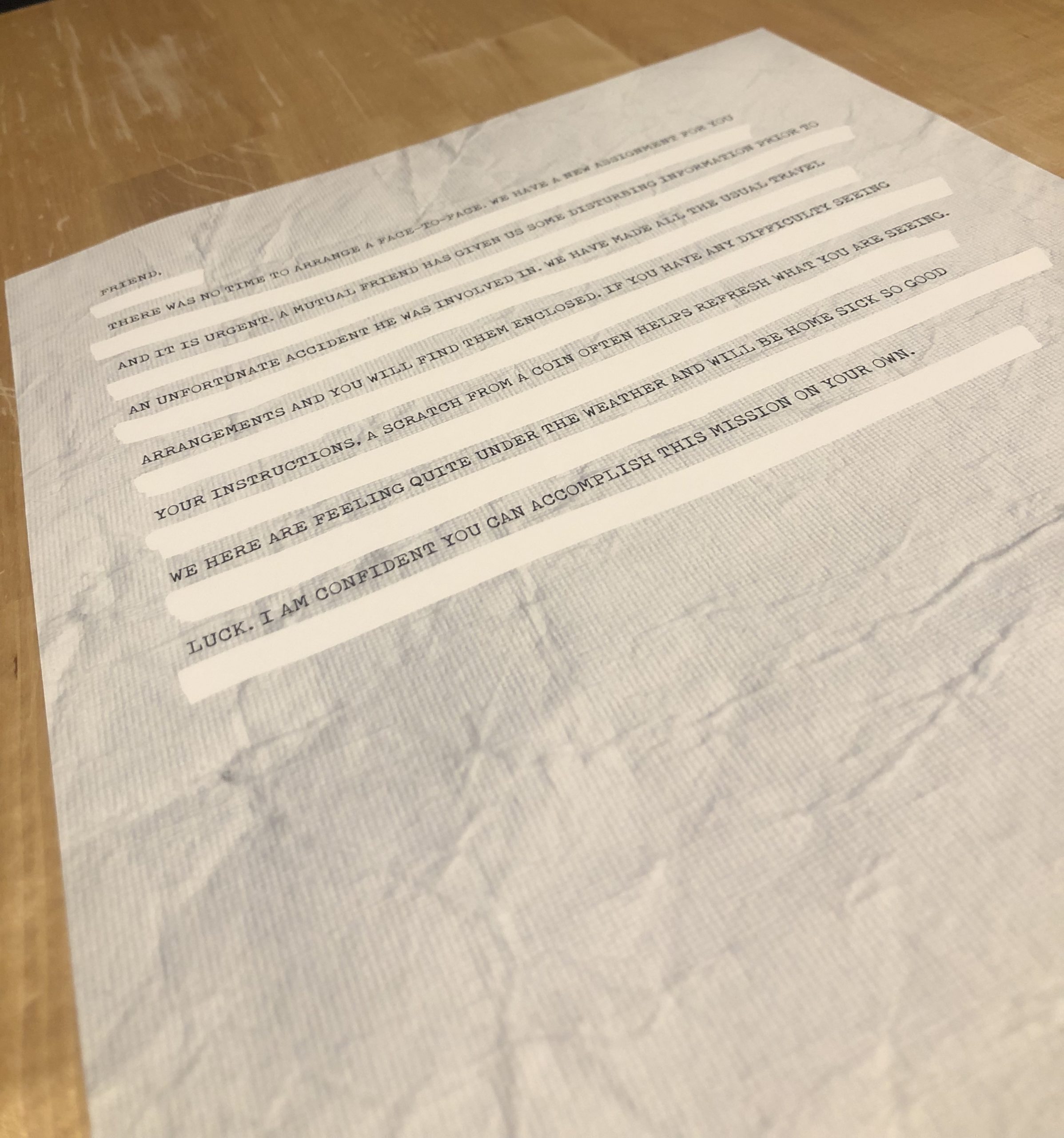 At first, I thought that the even number lines in the letter were whited out and I would not be able to read the entire document. Nope, read the words carefully and it tells you exactly what to do to uncover what’s hidden.