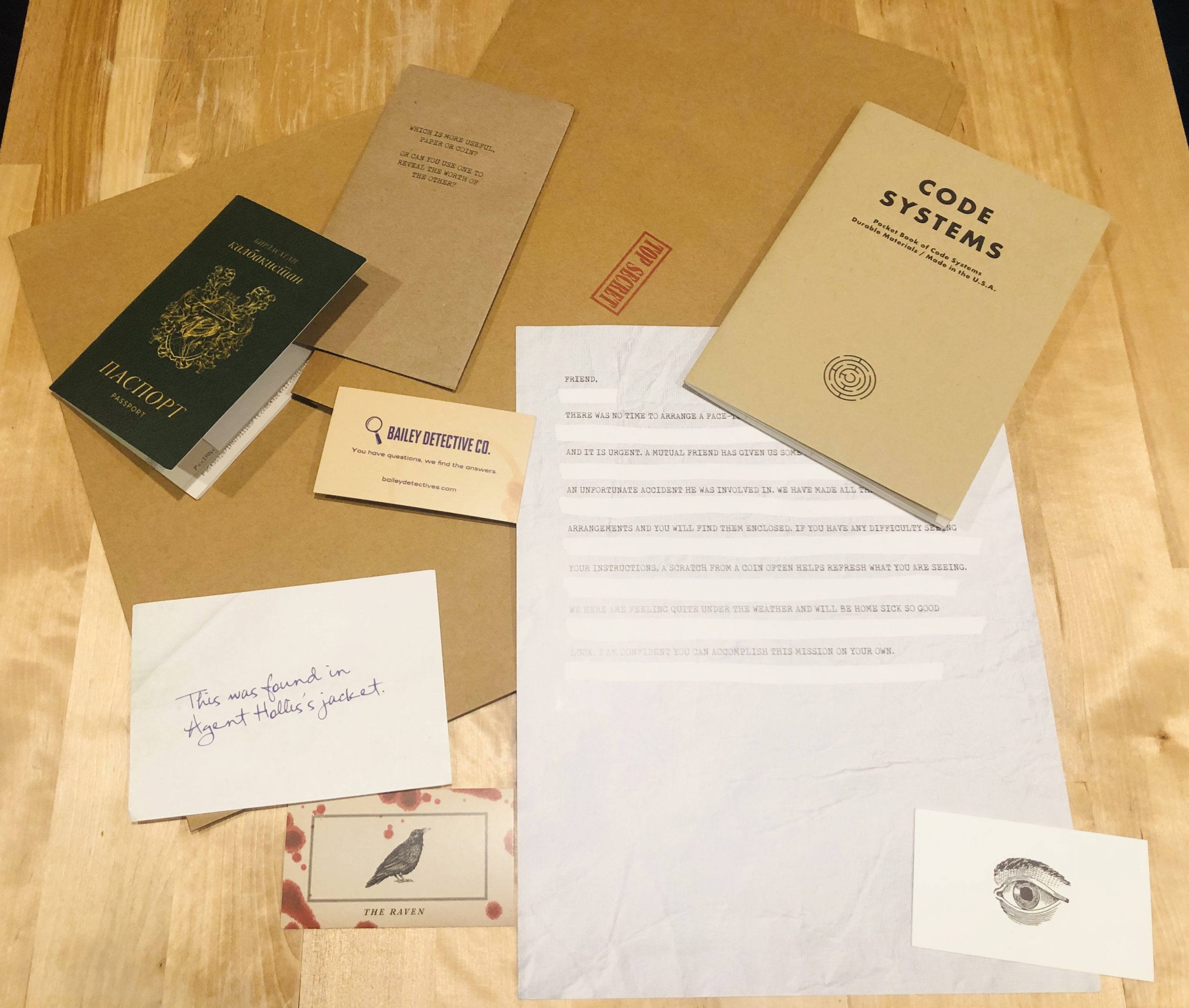 I found the familiar Bailey’s Detective Company card right away. Glad I will have a familiar person to help me crack this case! The game also had some other business cards, including one from “The Raven”, and a business card that was attached to this letter from Agent Hollis.