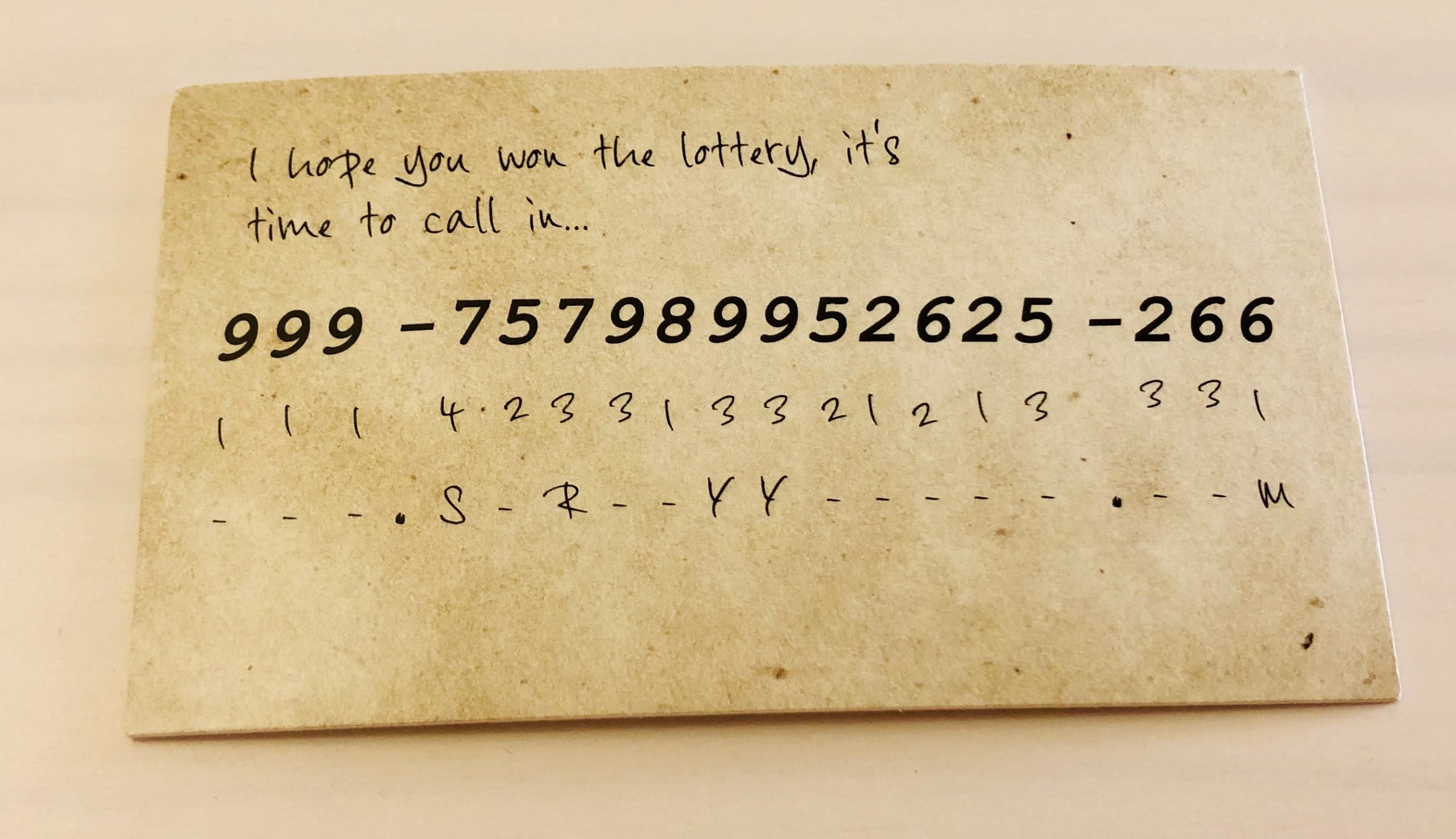 I really had no idea what I was supposed to do with this card. I know it’s some kind of clue to crack but, I couldn’t figure out which code I needed to use. I’ll come back to this in a bit.