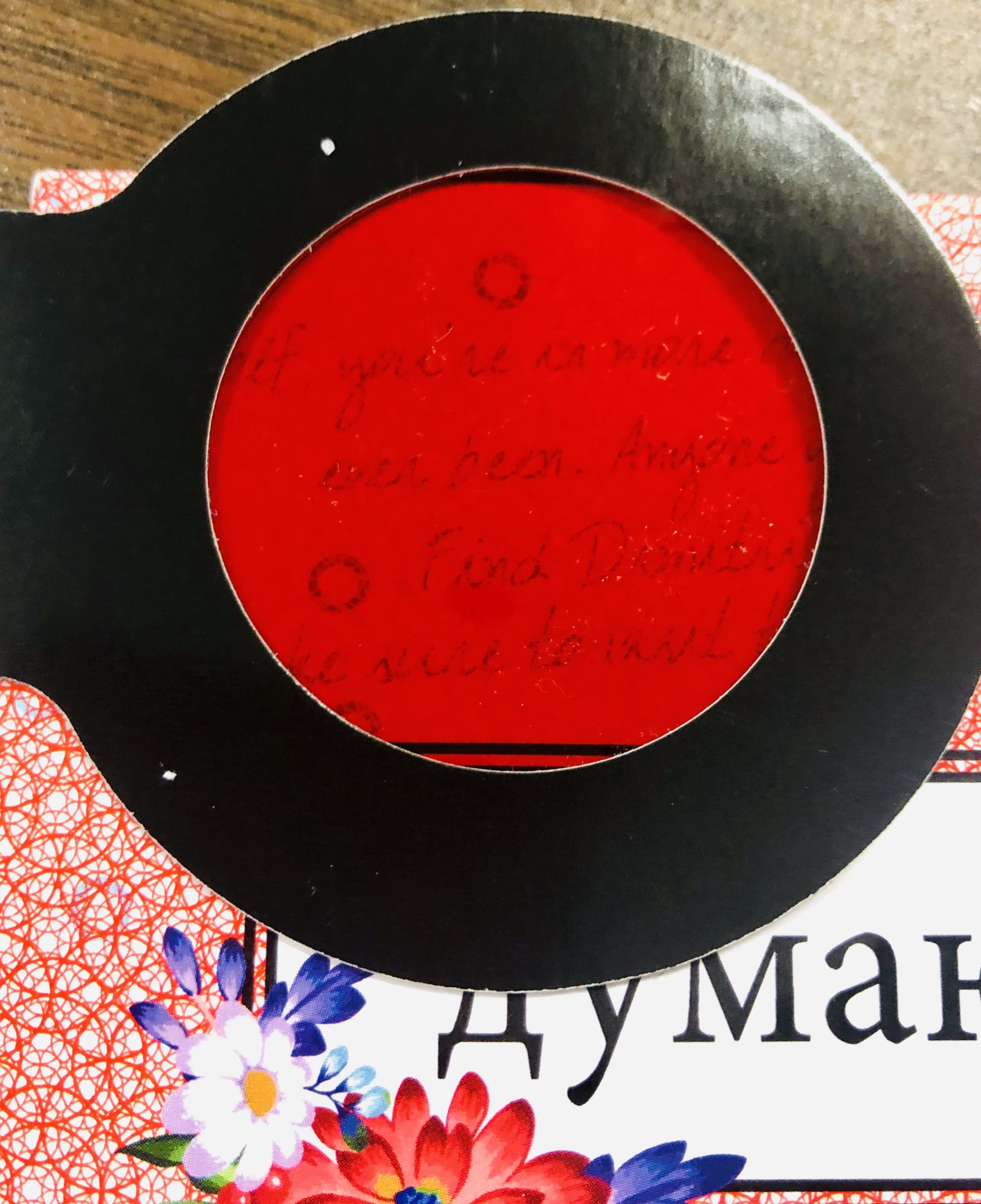 Next thing I noticed in the box was this note pad. If you look carefully at the message, there are a few uppercase letters. Looks like we must look over the rainbow to uncover the message. Also, take note of the lipstick kiss on it. Is this a woman’s notebook?