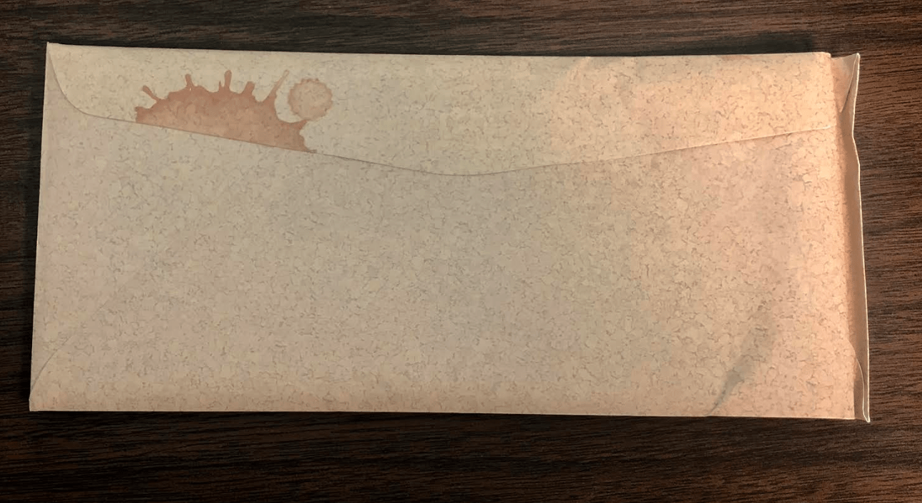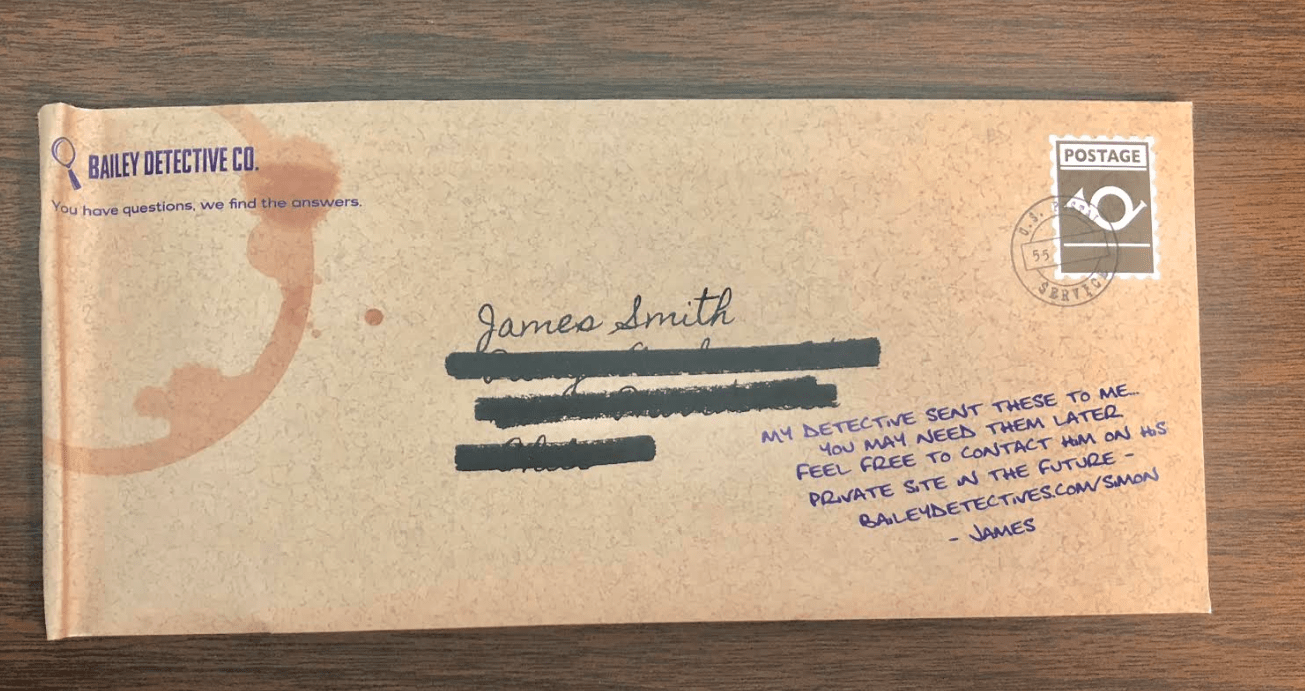 The detective letter from Bailey Detective Co. (Remember the business card above?) came in a sealed envelope with a stain that, I believe is some kind of…blood? Although odd because why would there be blood?