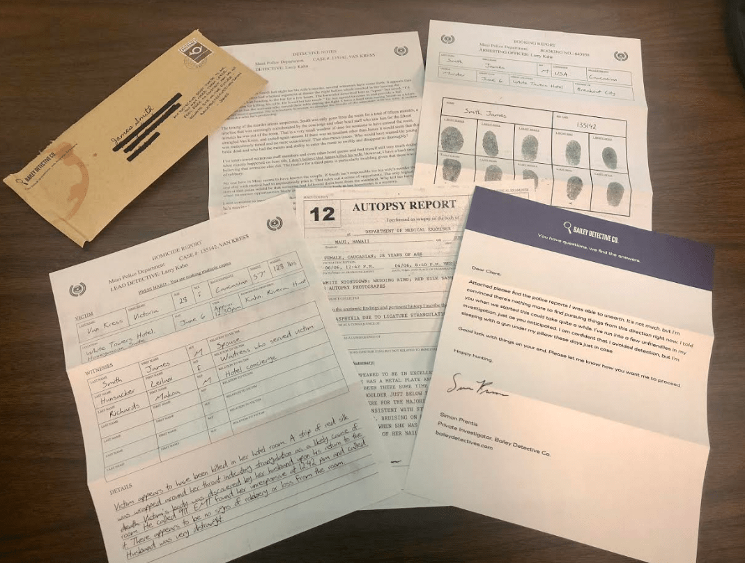 Inside you will receive 4 documents along with a letter from a Private Investigator: Simon Prentis. This includes an autopsy report, Police booking report with fingerprints, Detective notes from the Maui Police Department, and the homicide report from them.