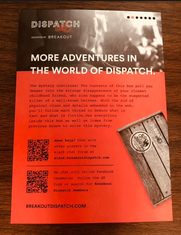 Website Description of Box: “Imagine a new kind of escape, one you can experience in the comfort of your own home – introducing Dispatch by Breakout. It’s a step apart from everyday entertainment—better than a book, more engaging than television—think of it as an immersive mystery where you wear the detective hat.