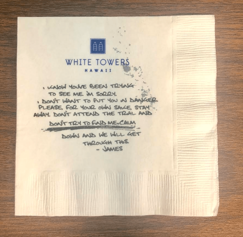 This is a napkin from the hotel he and Victoria were at before she was murdered. Why is one of the lines underlined? “Don’t try to find me. Calm…” is this a subliminal message?
