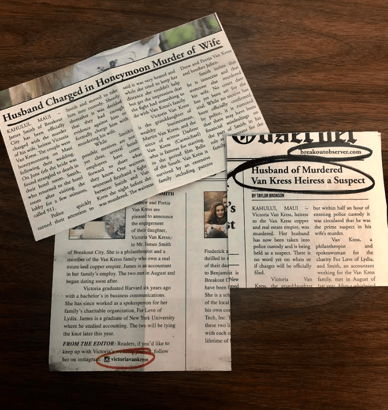 I noticed right away the circled items on the newspaper clippings. Oh look, an Instagram account (Hint: go to it). Oh, a website as well! (Yes, another hint: go to this website as well). On the website, you’ll discover some additional clues that include an accident that occurred.