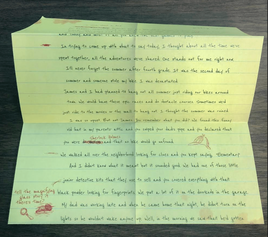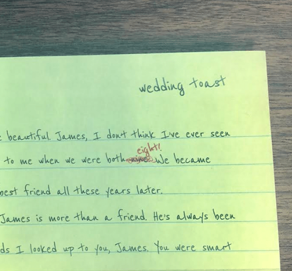 James asked you to write a toast for his wedding. Read this carefully as it gives a good backstory into your childhood with James, and how he was always the one wanting to figure things out, and solve them. Reading between the lines, I think it might be safe to say James is a pretty clever guy.