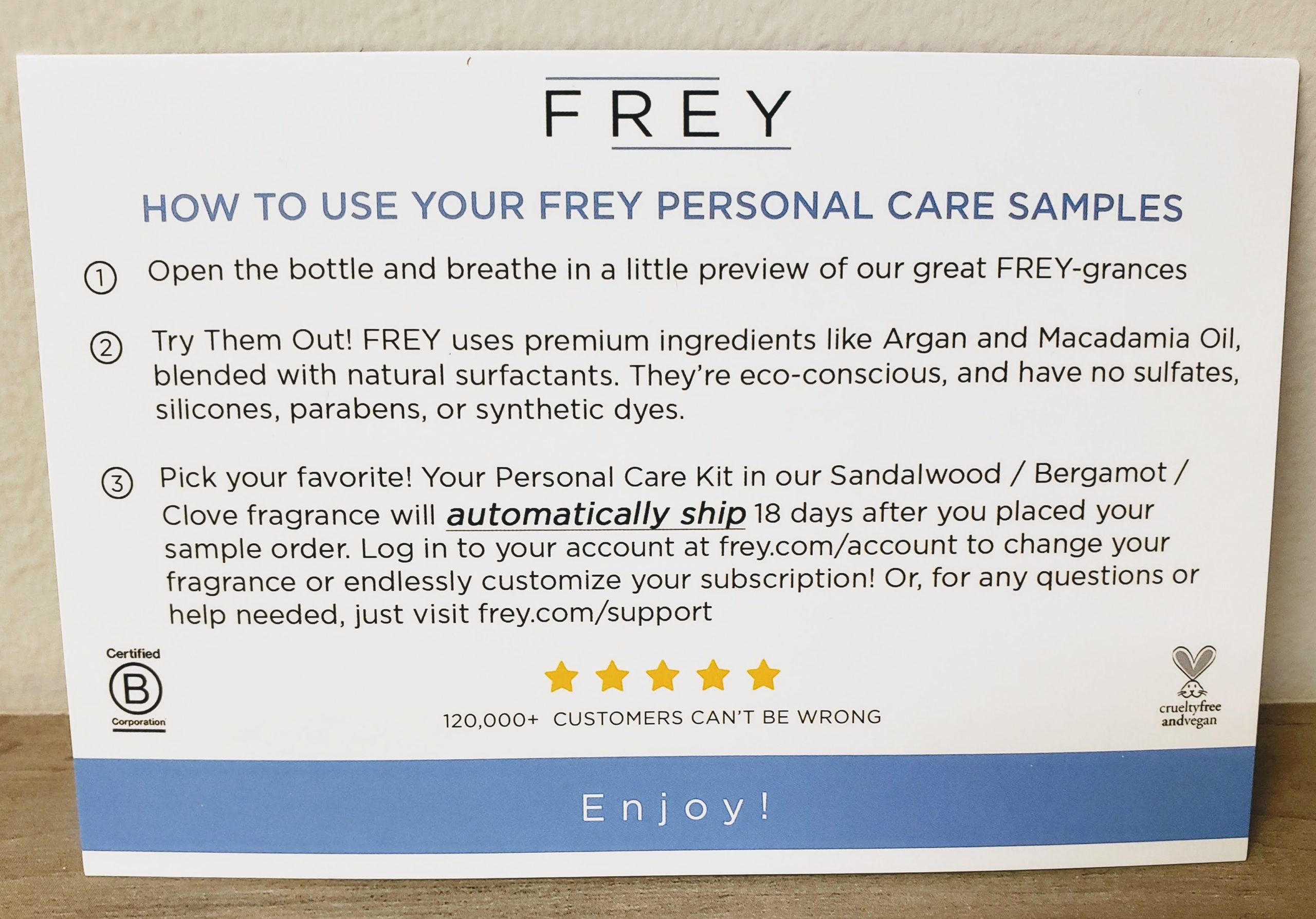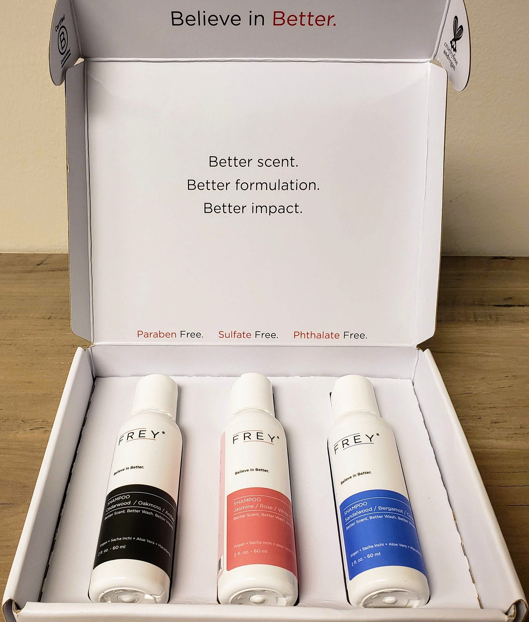 Previously FREY had sent us their Complete Laundry Kit for review, you can read that full review here. Before reviewing their products, I had never heard of FREY so I did some digging to find out if they would be something our readers would like to hear about. What I found was pretty amazing. They were founded by two brothers who were curious as to why the laundry industry had remained basically unchanged since the 1950s. Why the huge bottles of soap that are watered down to appear that consumers are getting more product and why all the harsh chemicals? Over the course of testing and reviewing their laundry kit, I fell in love with FREY. I have told a lot of readers about their free trial before realizing that I didn’t know what the trail boxes would look like. So I figured I would fork out the $1 to see what our readers could expect from FREY’s free trial. For the $1, I was able to get both the shampoo trial and the laundry trial, read on to see all my thoughts.