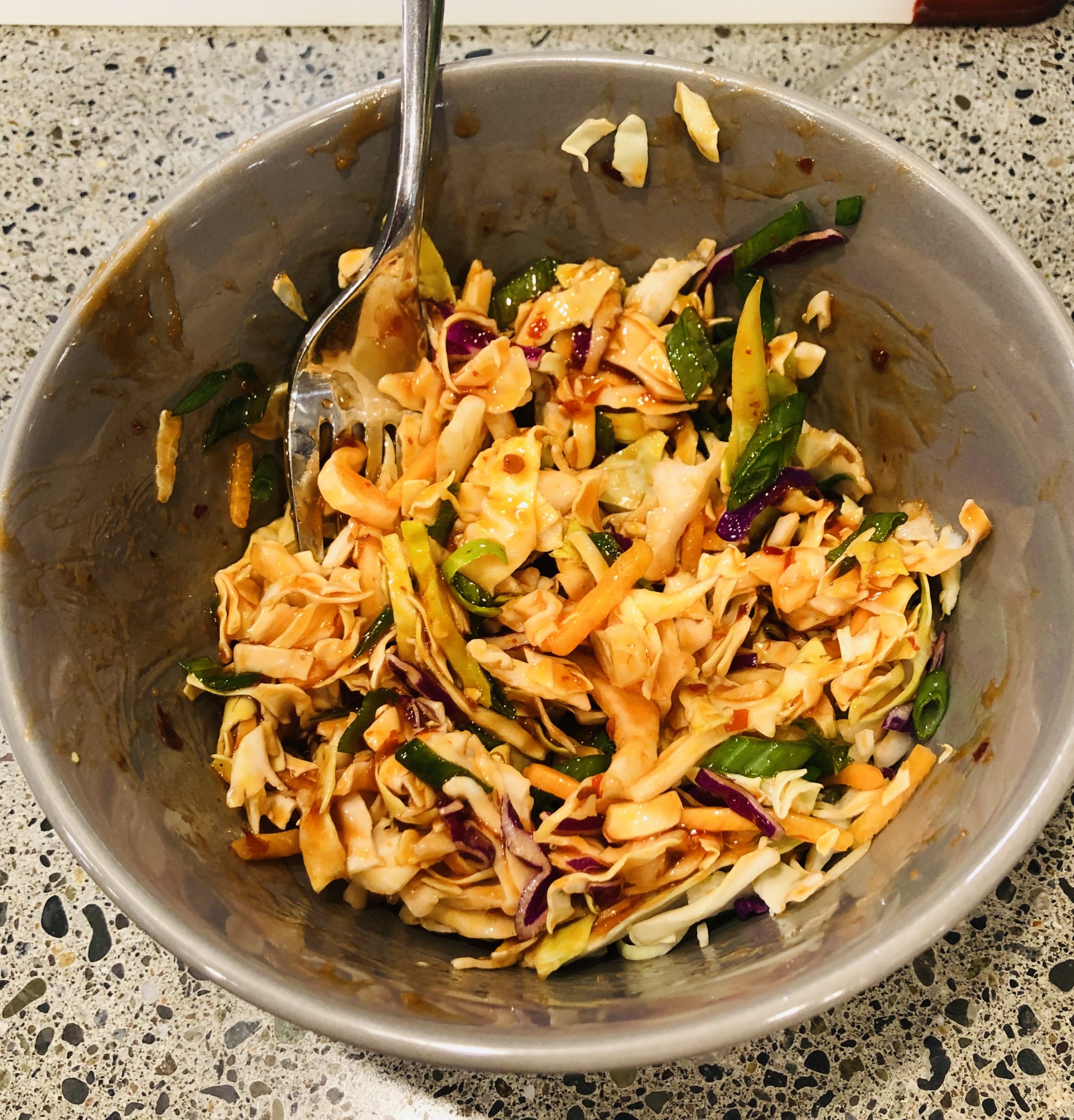 The slaw was a bit spicy, and I wish I had added a little less of the sweet chili sauce to it.