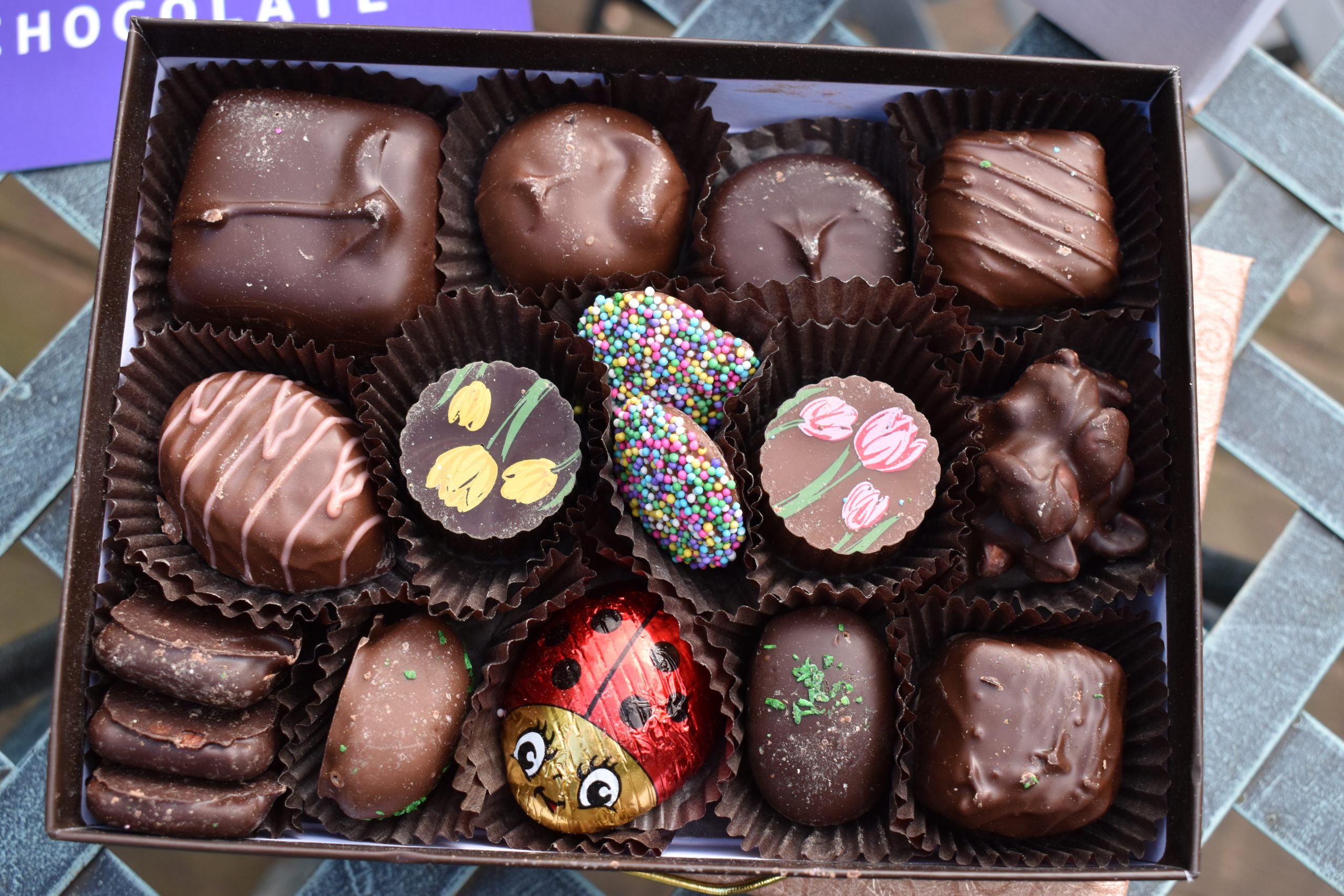 The pieces that were most attractive to us were tested first. That meant the ladybug and the flower pieces. The solid chocolate ladybug was a dense piece of rich chocolate. It was on the larger side so I shared it with my son who happily helped me taste test it. He thought it was good too. Next up, we tried both of the tulip truffles. The centers were thick and didn’t run out of the piece after cutting into it.