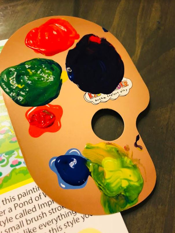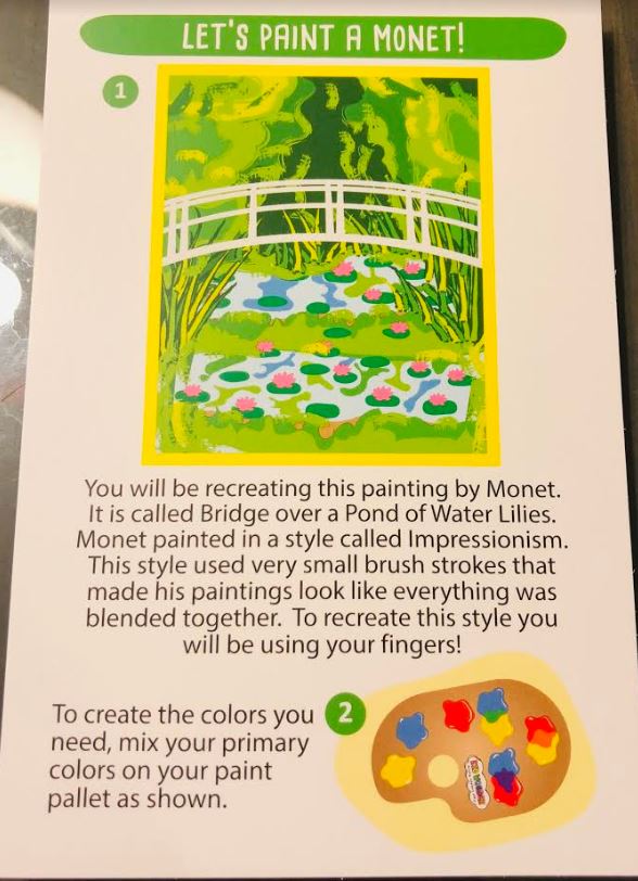 The art part of this activity was to copy Monat, and have your child draw with their fingers a replica of the painting pictured below. I also loved how the primary colors were explained on this instruction insert. Norah didn’t quite get it – but thought it was fun to mix things!