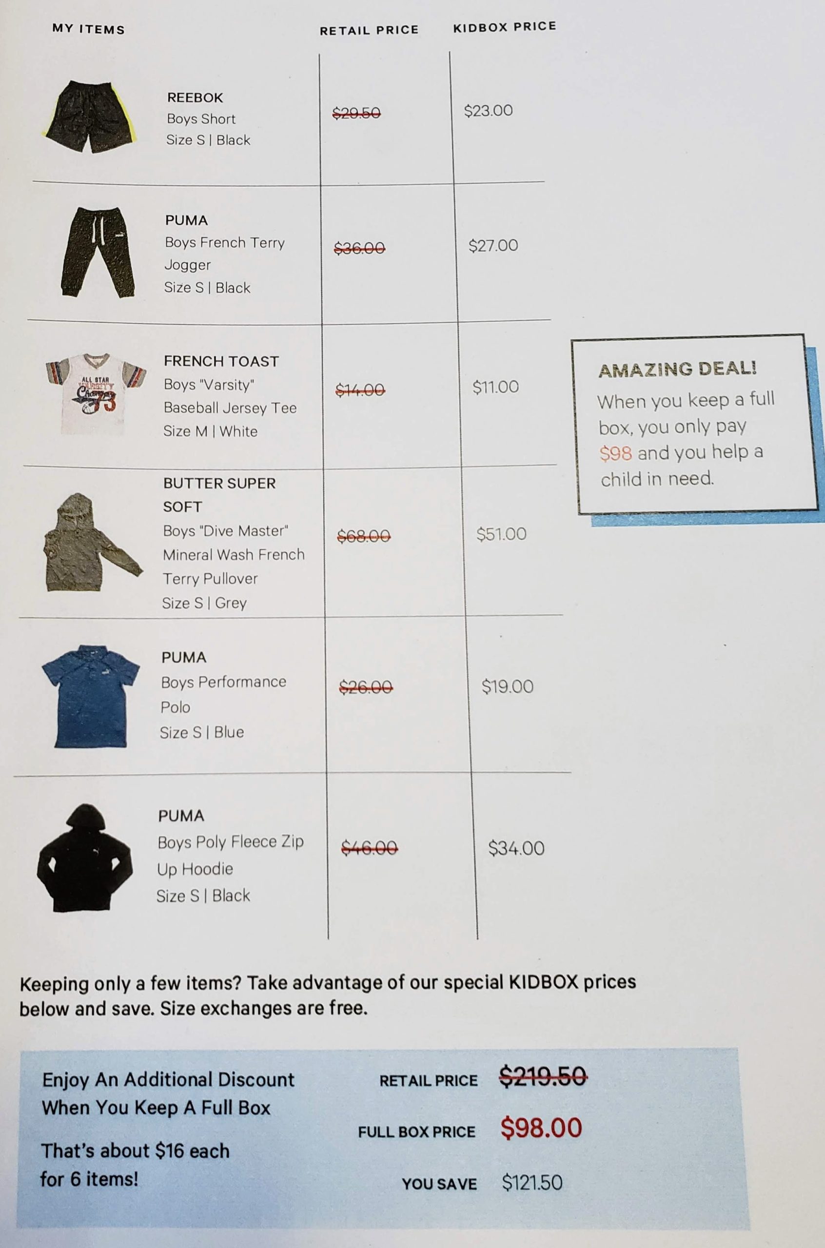 Price: Pay only for the clothes you keep or $98/box. BabyKidBox is less at $68 for the whole box. No styling fee!