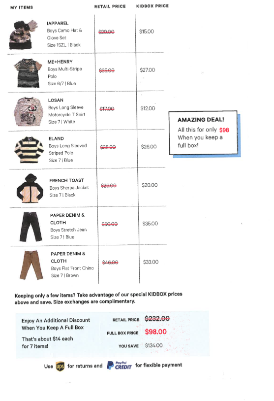 Price: Pay only for the clothes you keep or $98/box. BabyKidBox is less at $68 for the whole box. No styling fee!