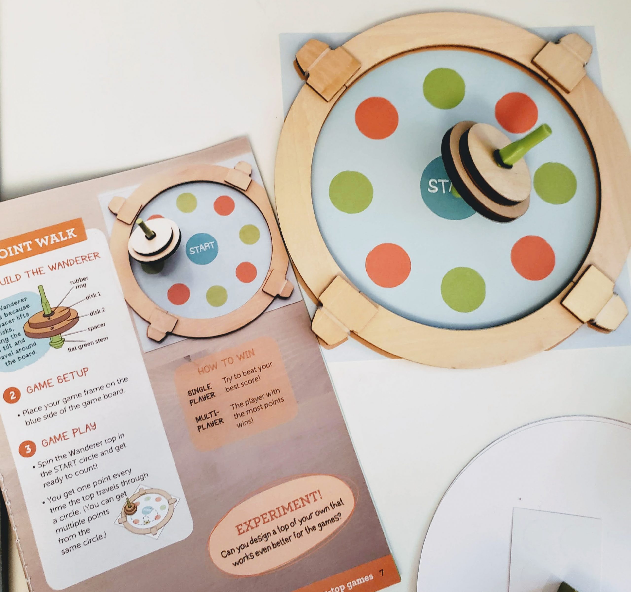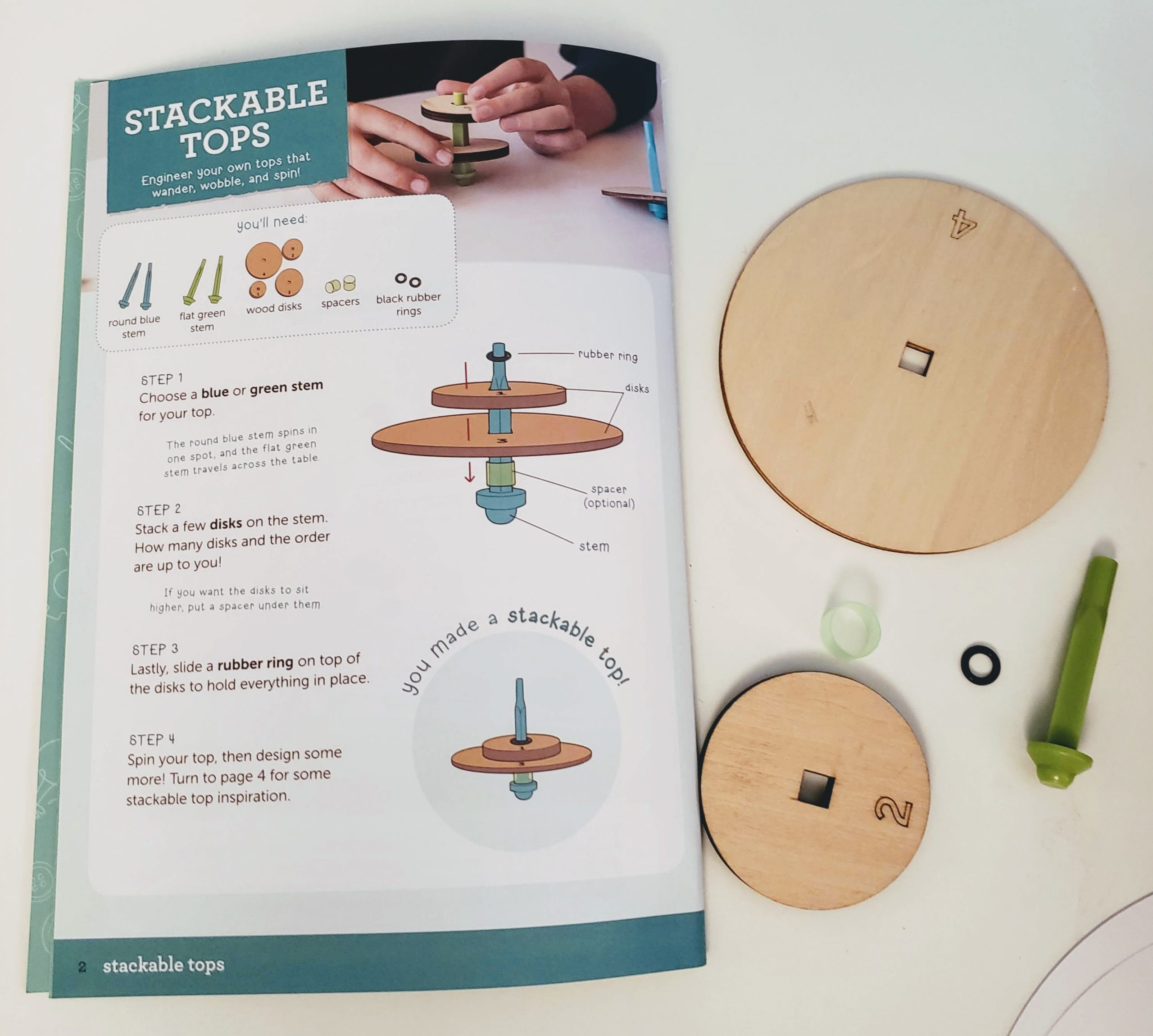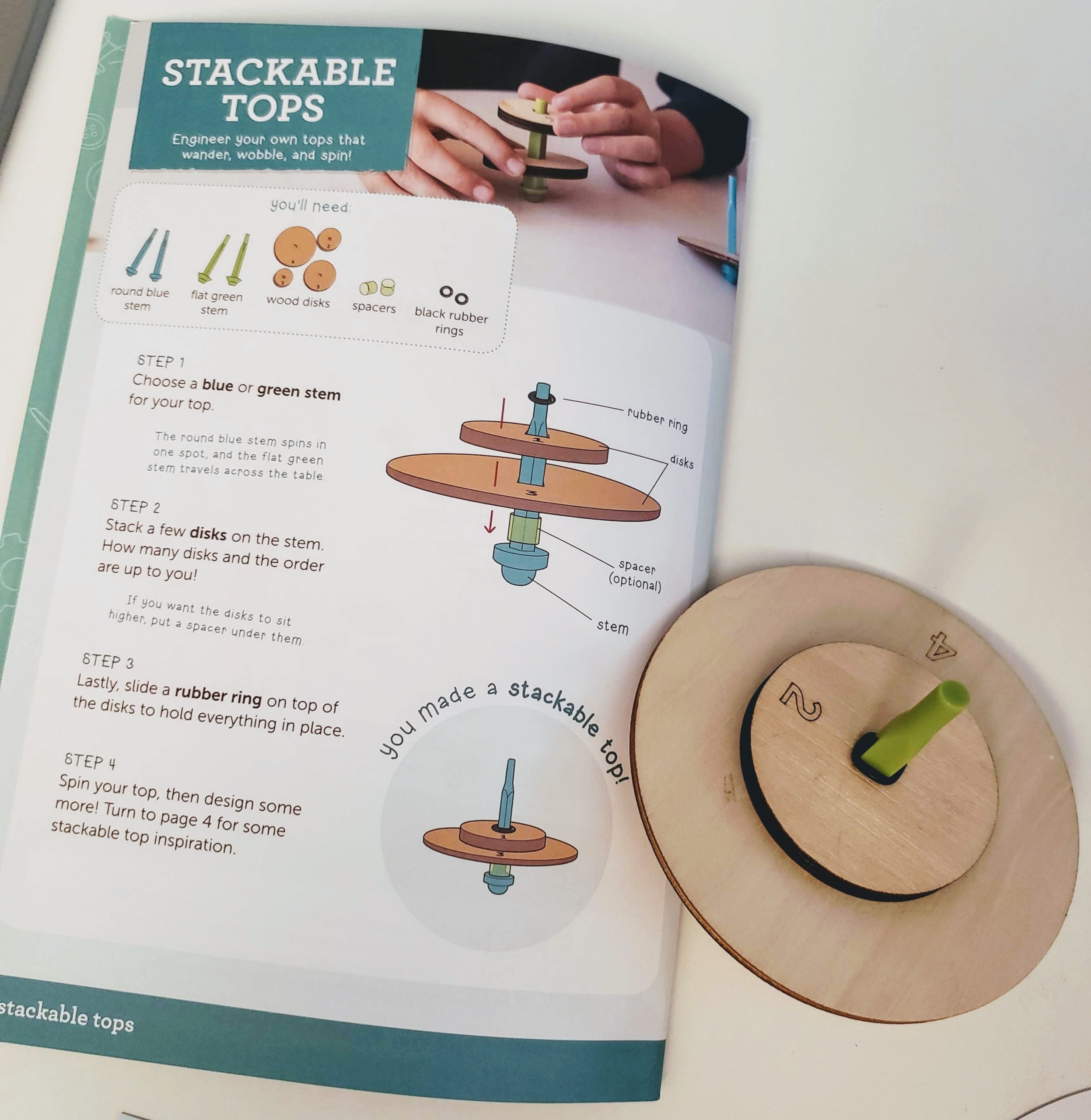 Our first activity was making tops. The instructions encouraged us to try different variations and to note how changing the disc sizes and the spacing would change the spin. Although my son wasn’t up for documenting the differences in the tops he created, he did appreciate seeing how different variations performed. We actually spent the better part of an hour playing with combinations. He also had an idea to use a marker to design the top of one of the tops and noticed how neat it looked when it was spinning.