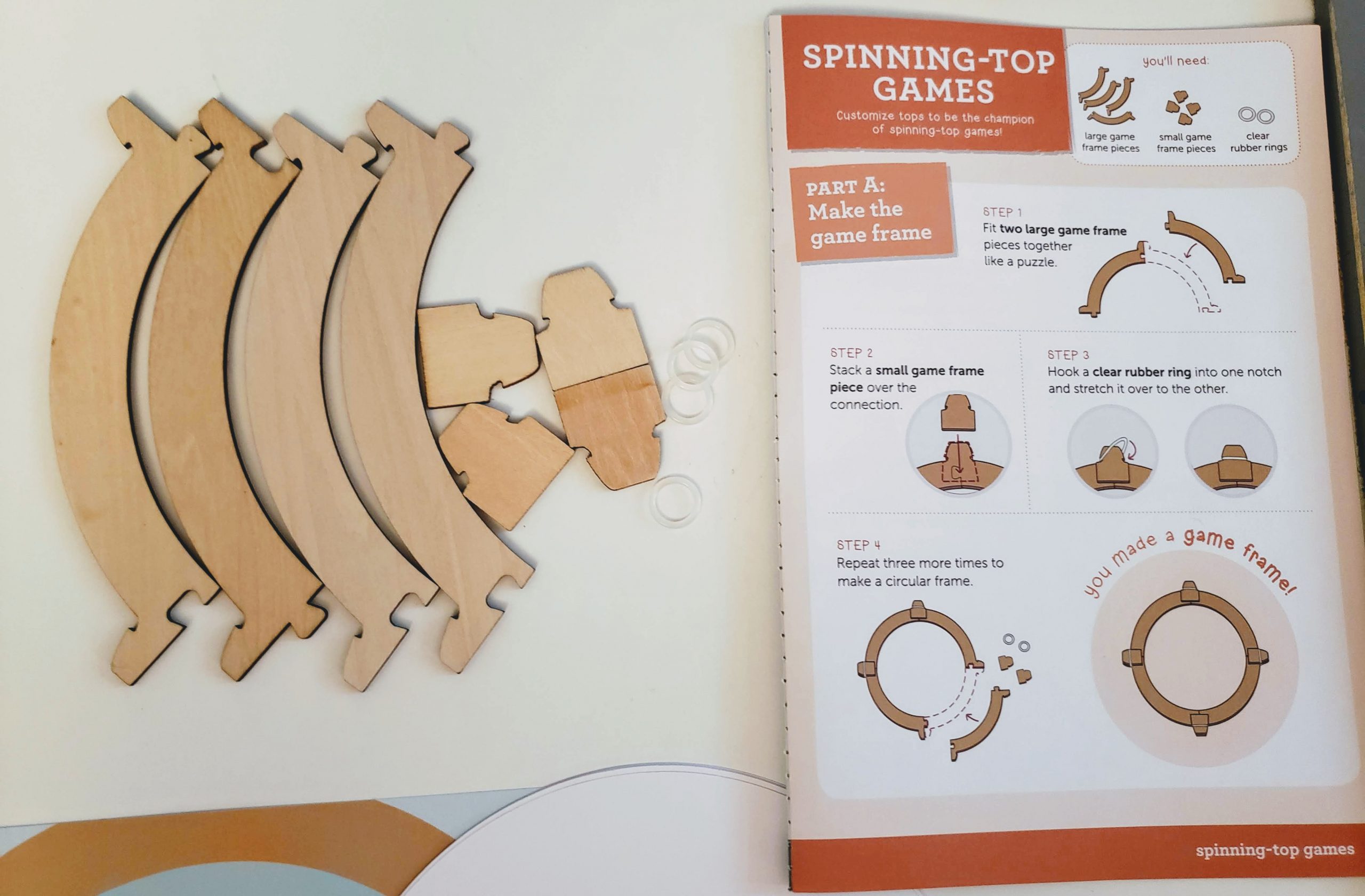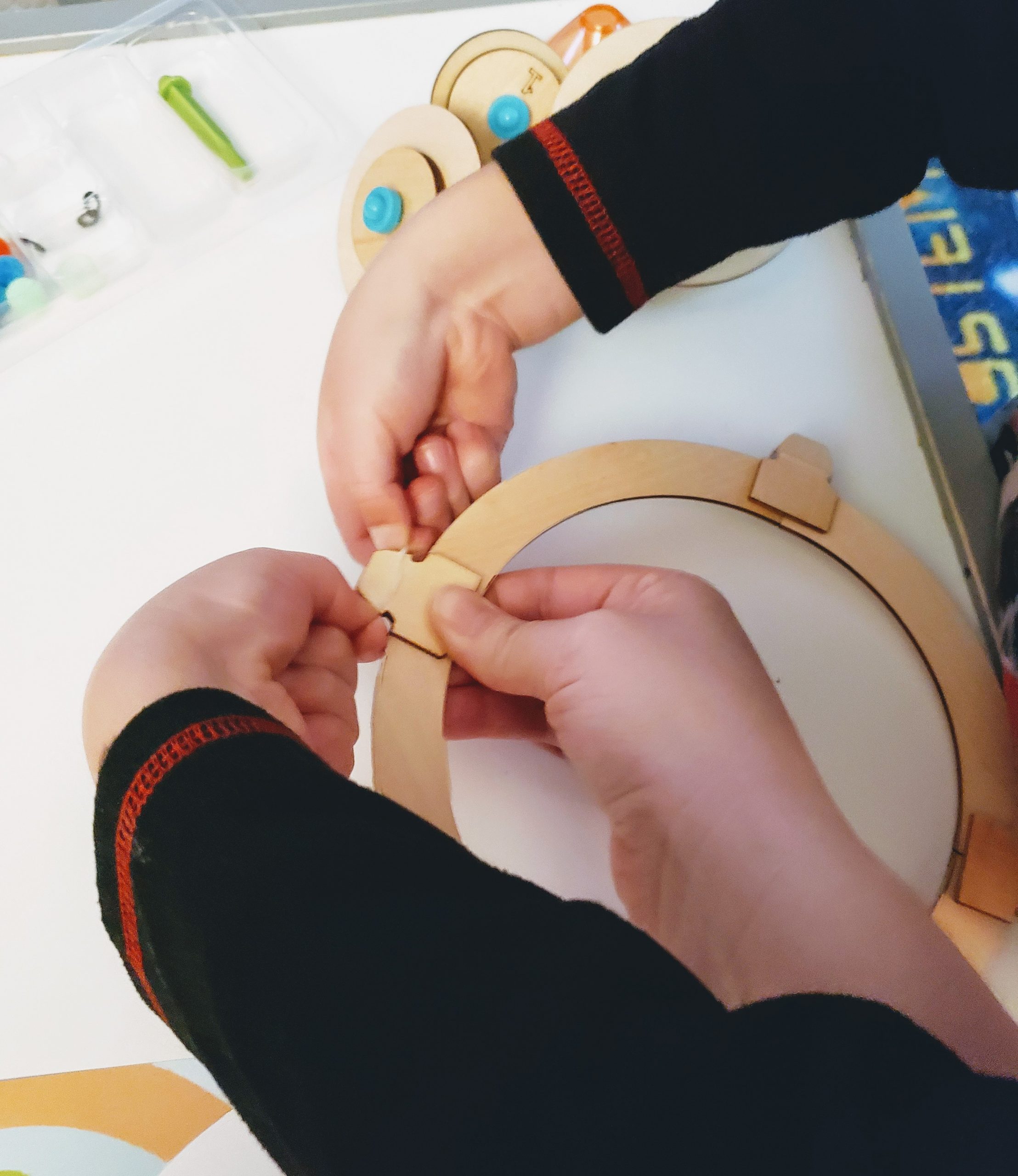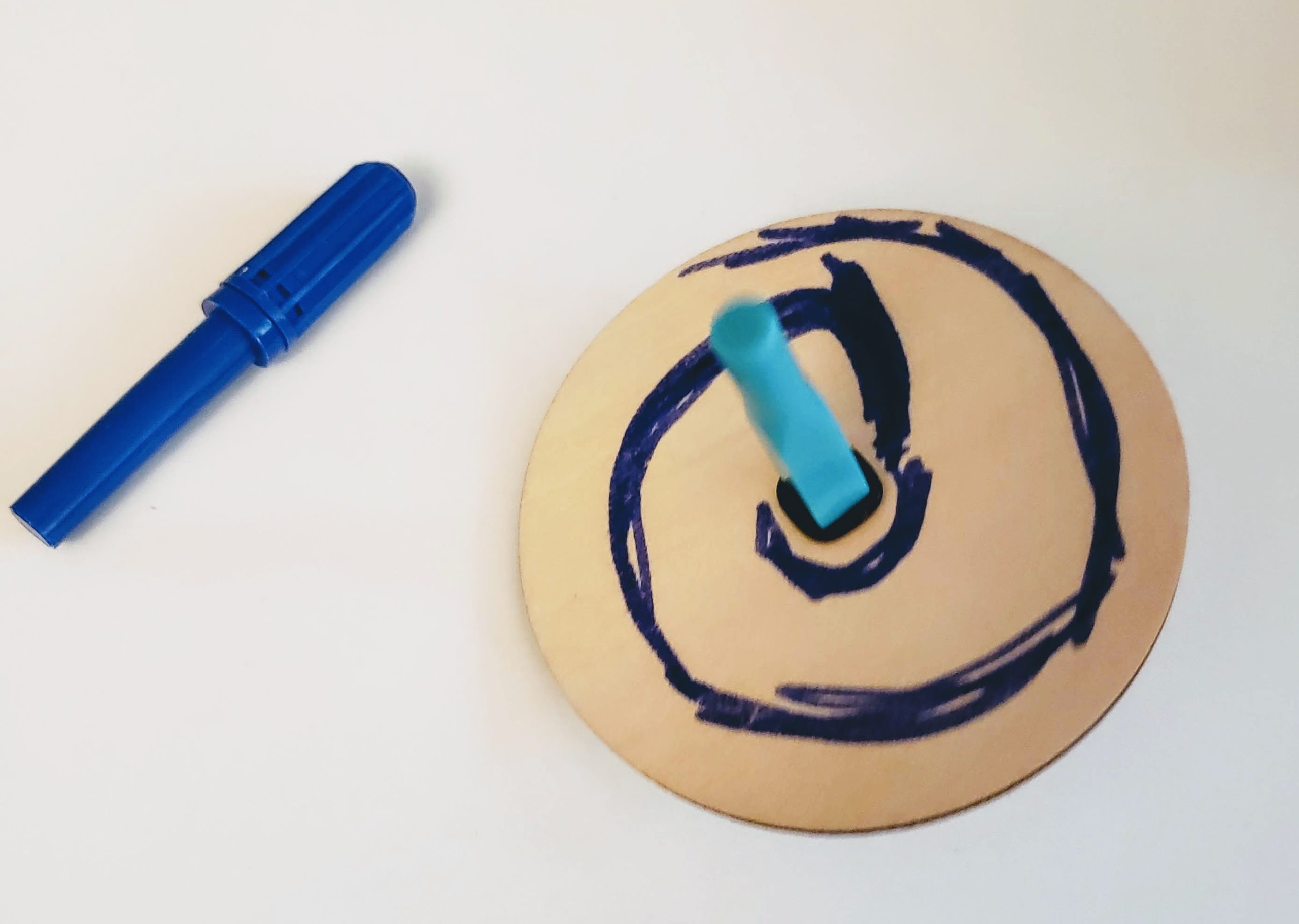Our first activity was making tops. The instructions encouraged us to try different variations and to note how changing the disc sizes and the spacing would change the spin. Although my son wasn’t up for documenting the differences in the tops he created, he did appreciate seeing how different variations performed. We actually spent the better part of an hour playing with combinations. He also had an idea to use a marker to design the top of one of the tops and noticed how neat it looked when it was spinning.