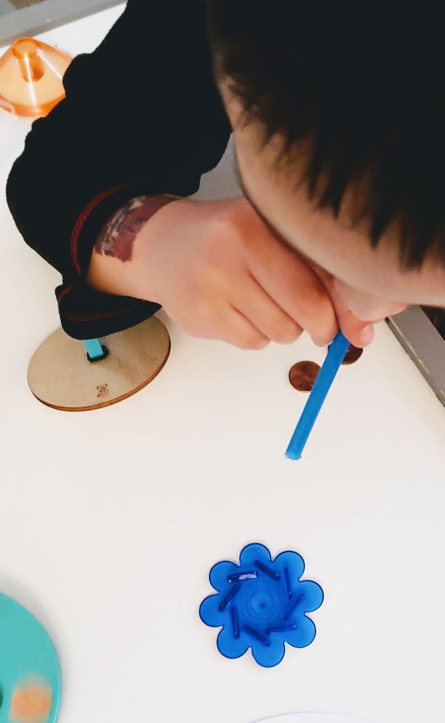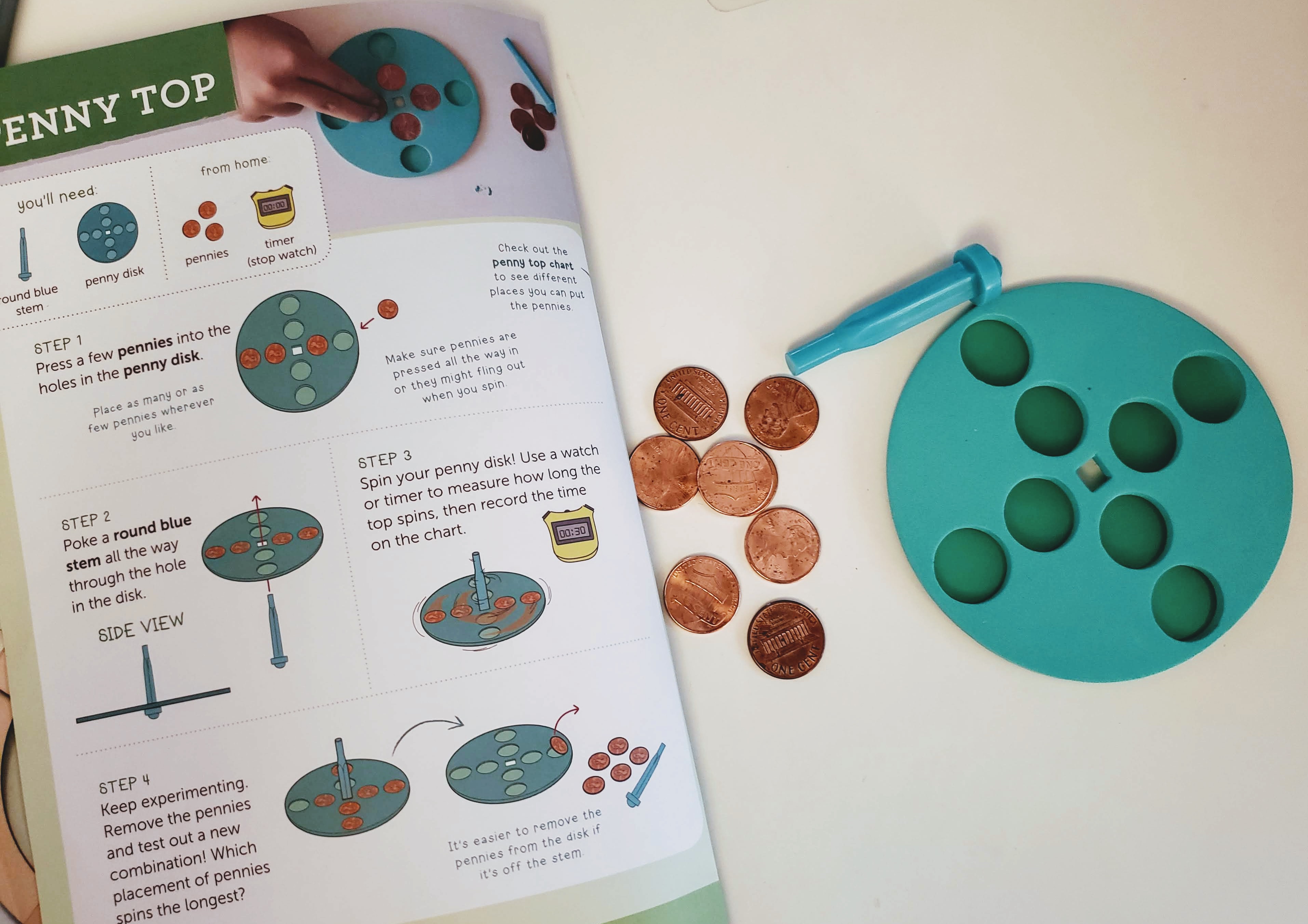 This was my son’s least favorite activity. I thought it looked really cool and I had fun playing around with the penny layout, however no matter how hard we tried the pennies would fly out. My son was concerned a window might break, he is a cautious kid no doubt about that! Still I thought it was neat that he was able to see another kind of top.