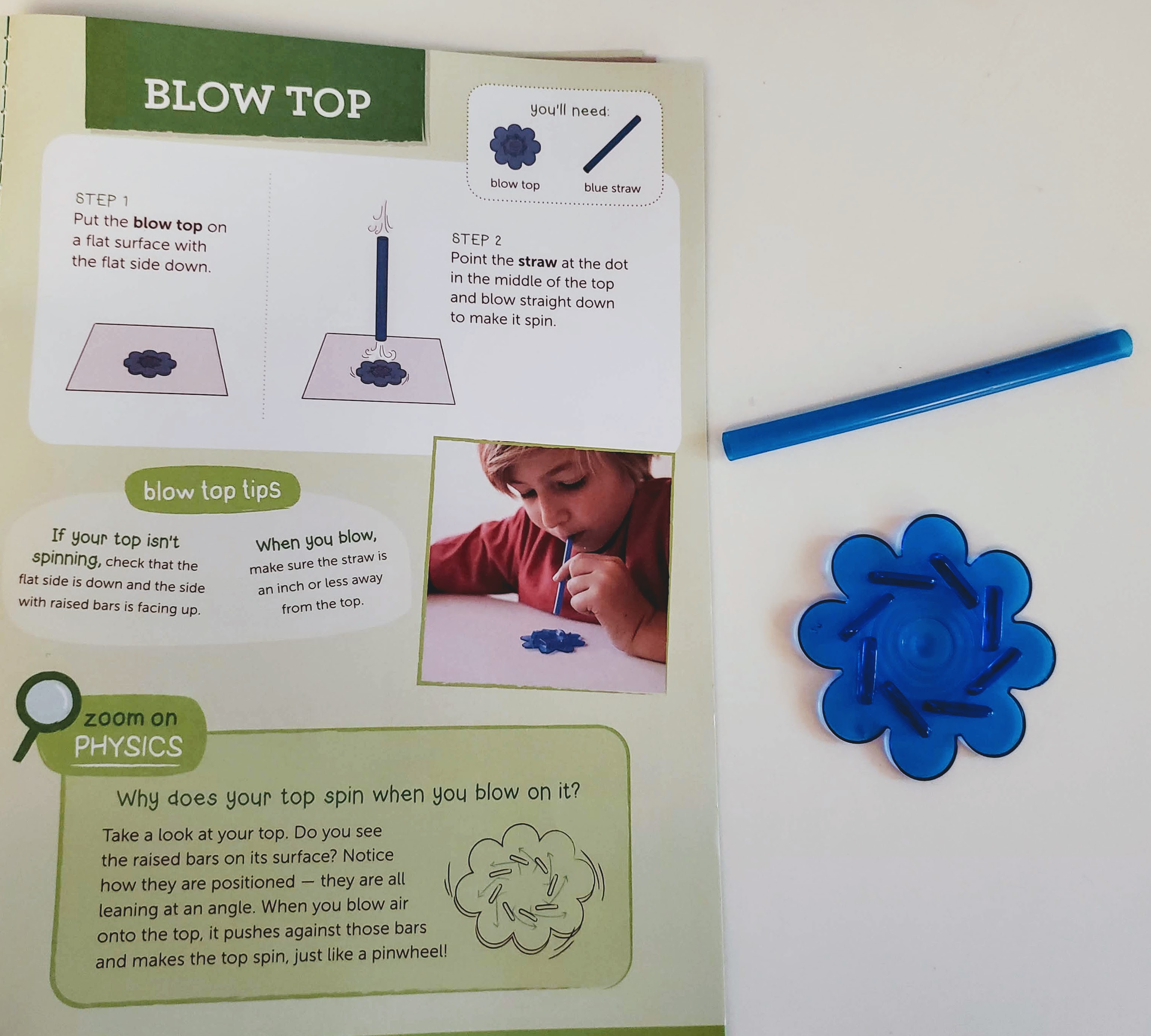Our final activity was the blow top. The whole time we completed the other activities my son was holding the straw and top trying to figure out what we would end up using them for. While I was playing with the penny top, he happened to try to use the straw to blow on this top and low and behold it worked. He was so excited that he figured it out without any instructions. I have to say that was the highlight of this whole box. Seeing the confidence on his face was amazing!