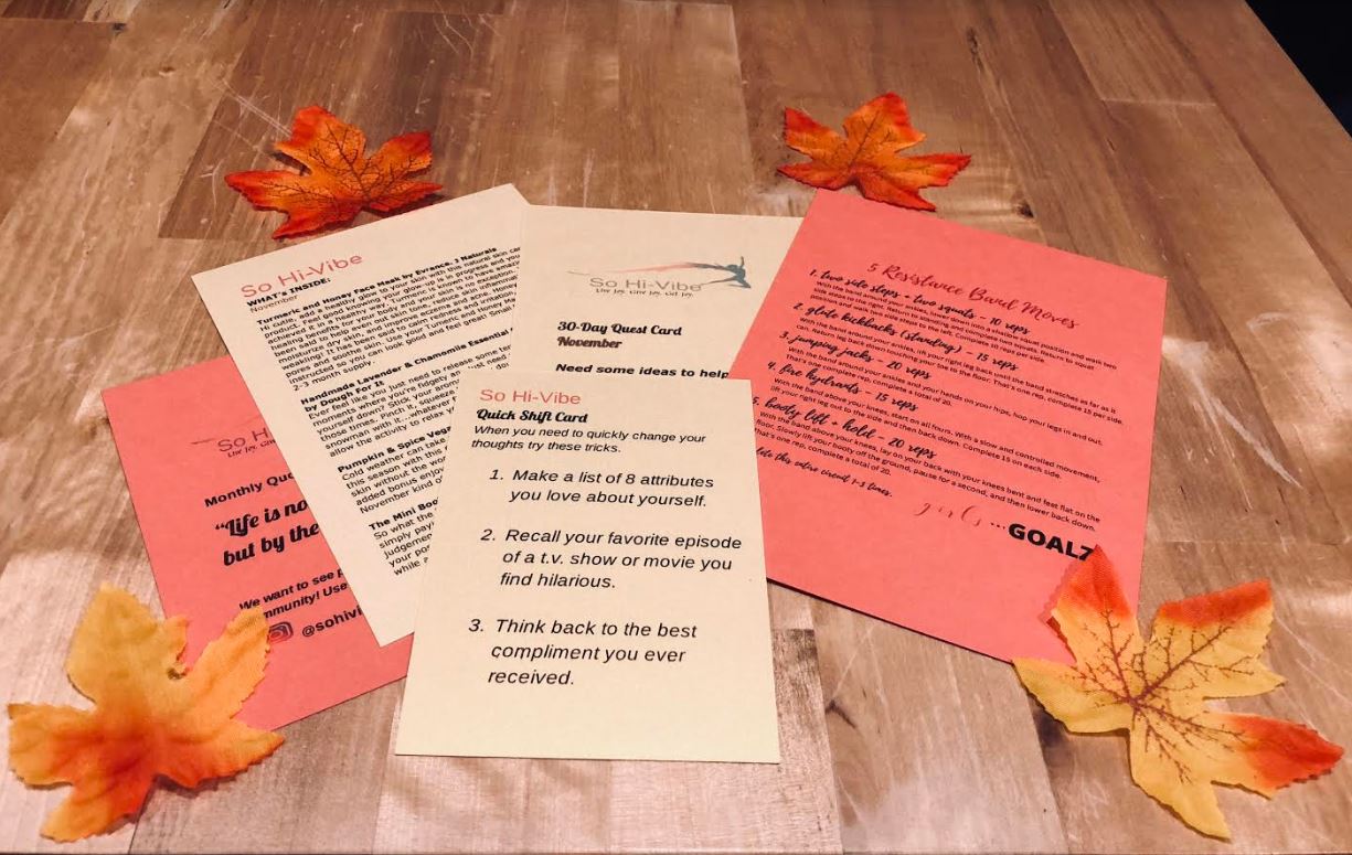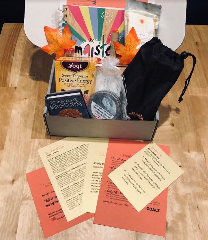 Website Description of Box: “So Hi-Vibe brings you practical tools for inner peace . Each box contains 5-7 vibe boosting items to help you maintain a state of high vibration and keep a cycle of positive emotions flowing throughout your day. You will also receive 30 Quest Activity Suggestions, Quick Shift tools, fun ways to connect, and more awesome So Hi-Vibe greatness!”