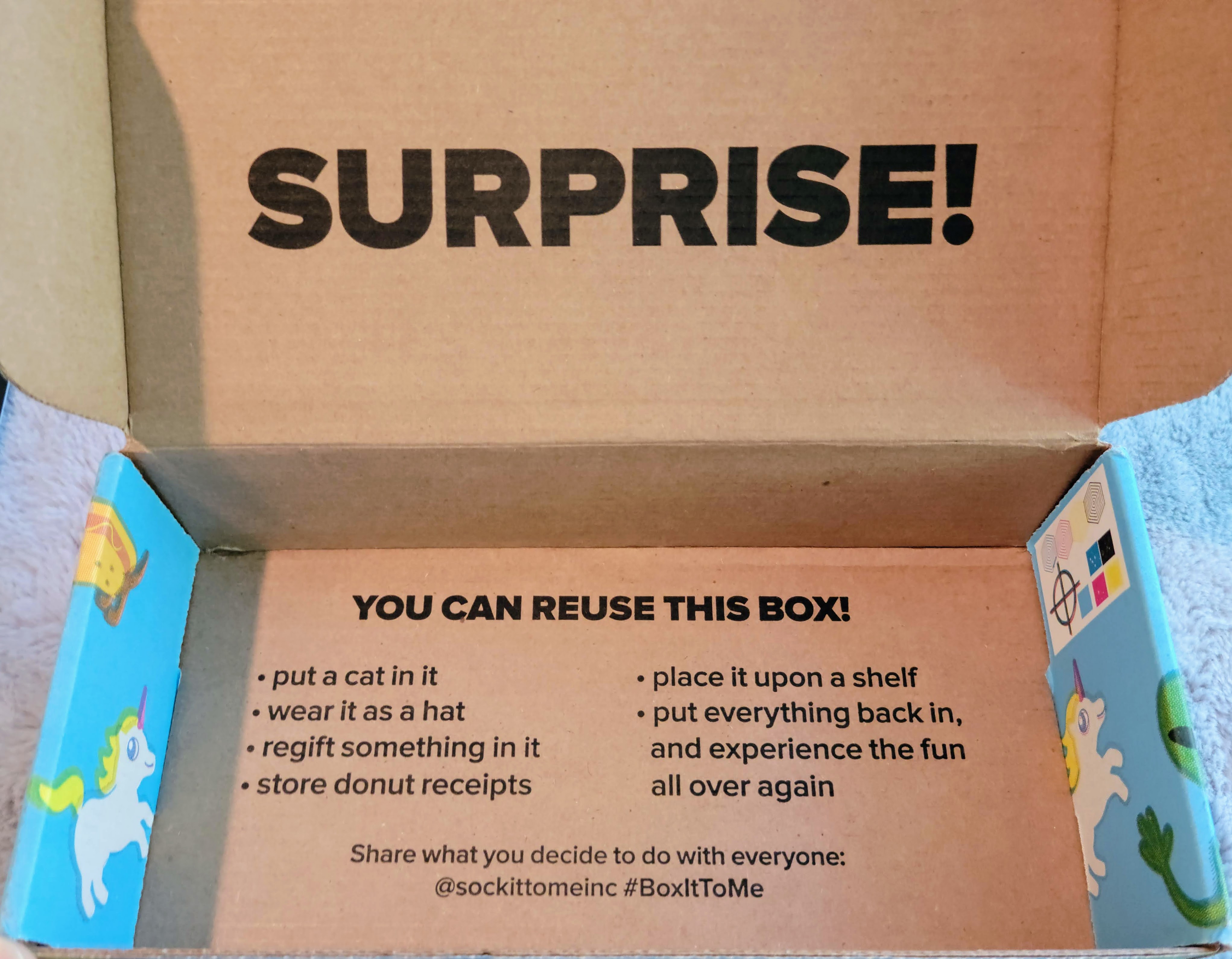 Website Description of Box: “Sock It to Me Monthly is full of exclusive sneak peeks. That means you’ll be wearing socks that won’t hit the shelves for months (or years) to come! It’s like being part of a VIP club for your feet. All you need to do is tell us whether this subscription is for you, or for someone else; where you want us to send it; which type of socks you want (men’s or women’s); and how long you want the subscription for. Add it to your cart, pay for it all now, and then just sit back and wait for awesomeness delivered monthly! It’s really that simple. As you increase your subscription length, you get more value. Not only does the discount per pair increase, but you’re getting free shipping AND an extra not-a-sock surprise in every box. All guaranteed to be the fun, thoughtful, and out-of-the-box stuff you expect from your friends here at Sock It to Me.”