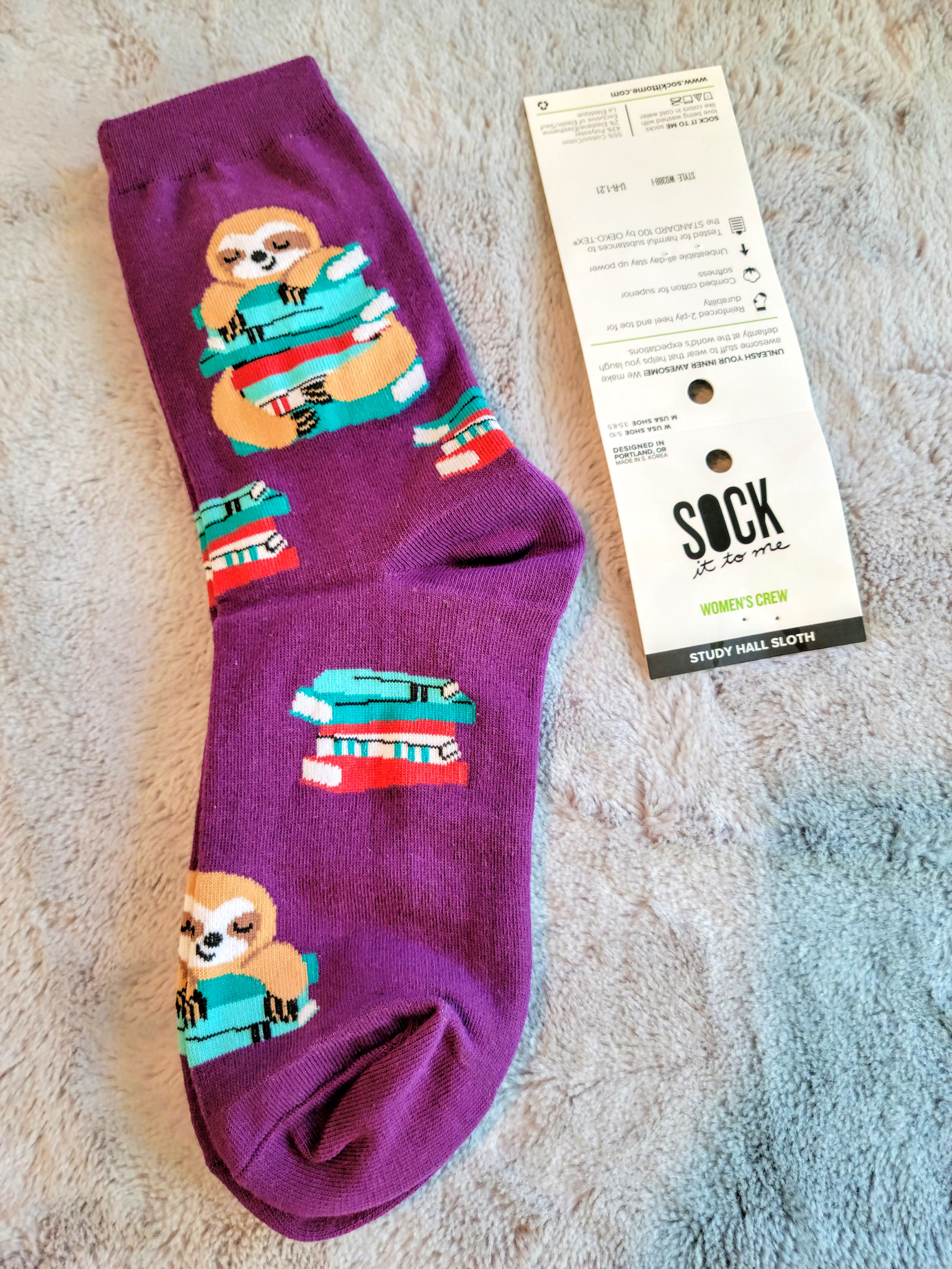 Personally, I have really wide calves. Therefore, I didn’t attempt to wear the Knee Highs. I ended up setting those aside to give to my co-blogger, Noelle, who happens to love cats! The overall quality of the sloth socks was really nice. They were soft and just plush enough to be comfy without making me sweat. I was able to wear and wash them about four times so far. The quality is holding up nicely and they are becoming my favorite pair of socks! And the bookmark is being put to good use too.