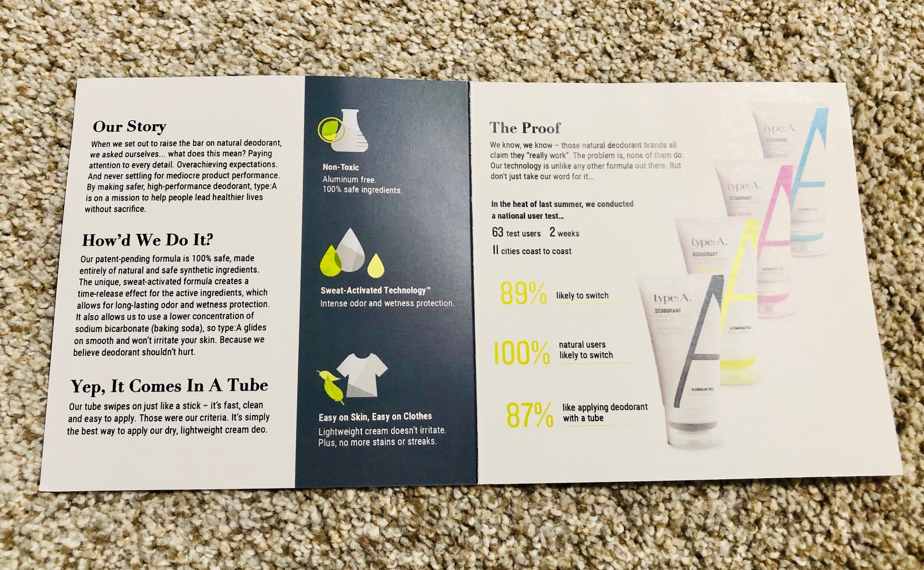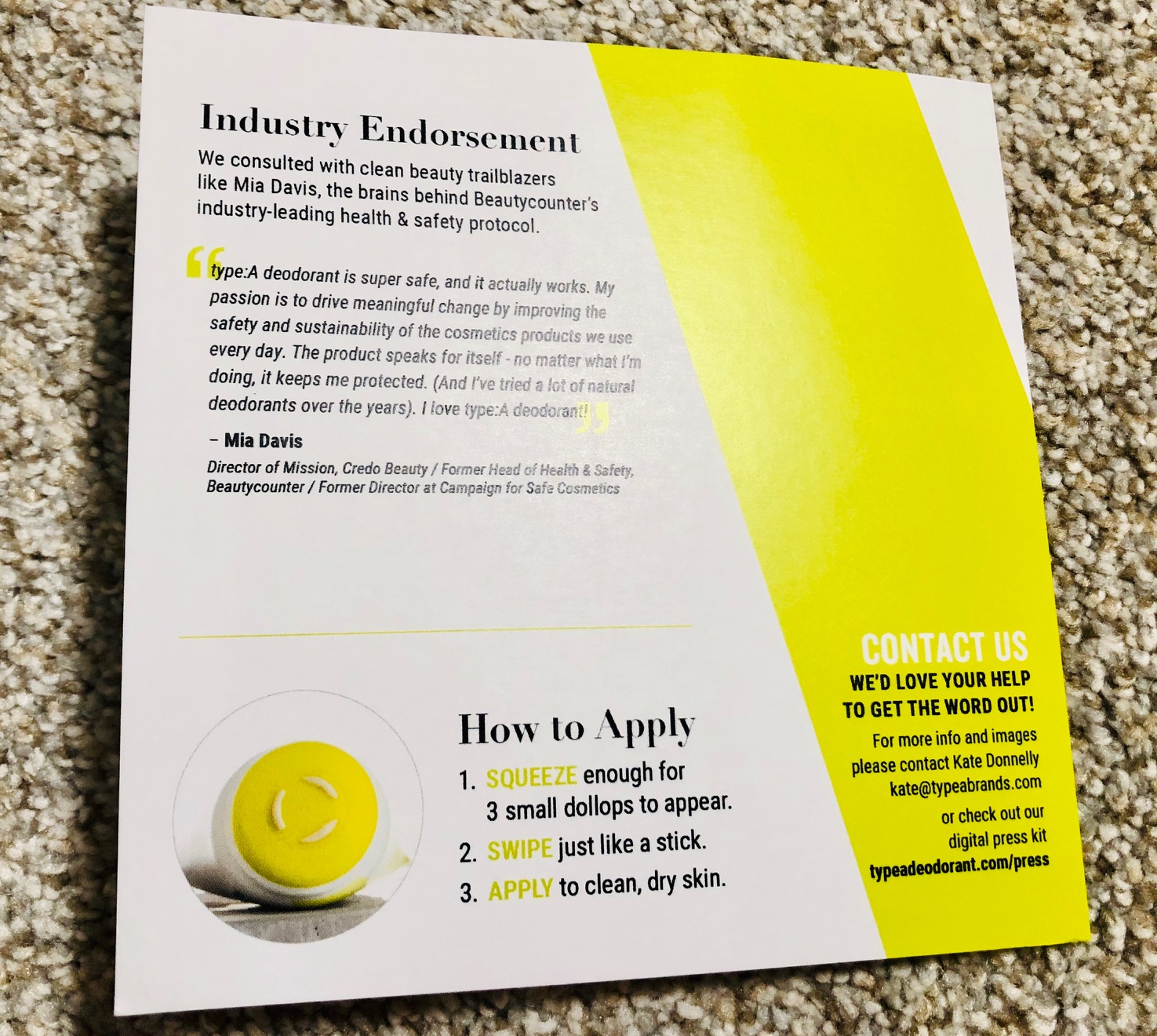 Included with the deodorant was also this helpful pamphlet. Inside it not only explains how type: A works and why you should choose them but, it also gives a back story on the company and how they created this product. I like the idea of a cream deodorant. I’ve honestly never used one before so I was very excited to try this out.